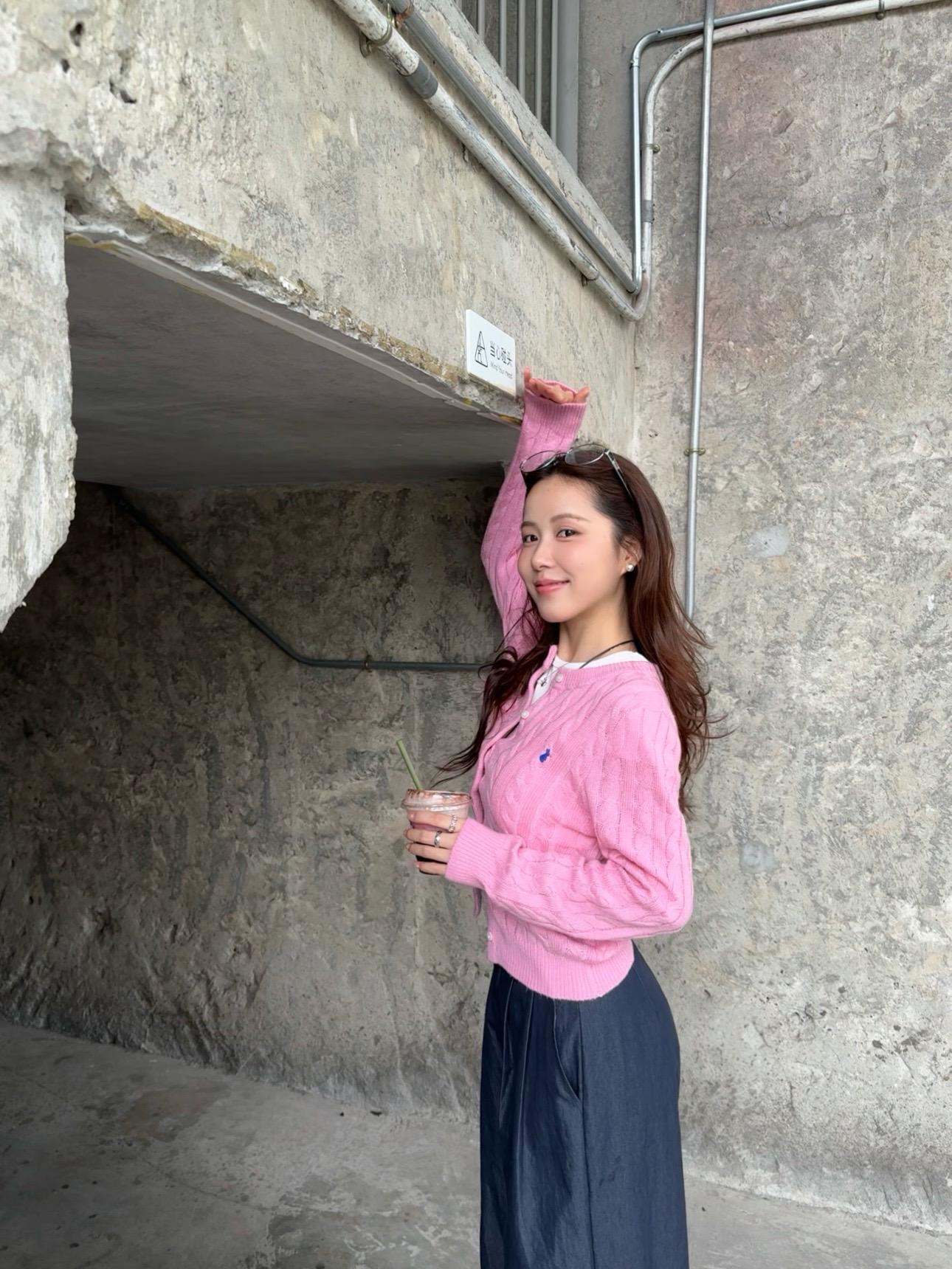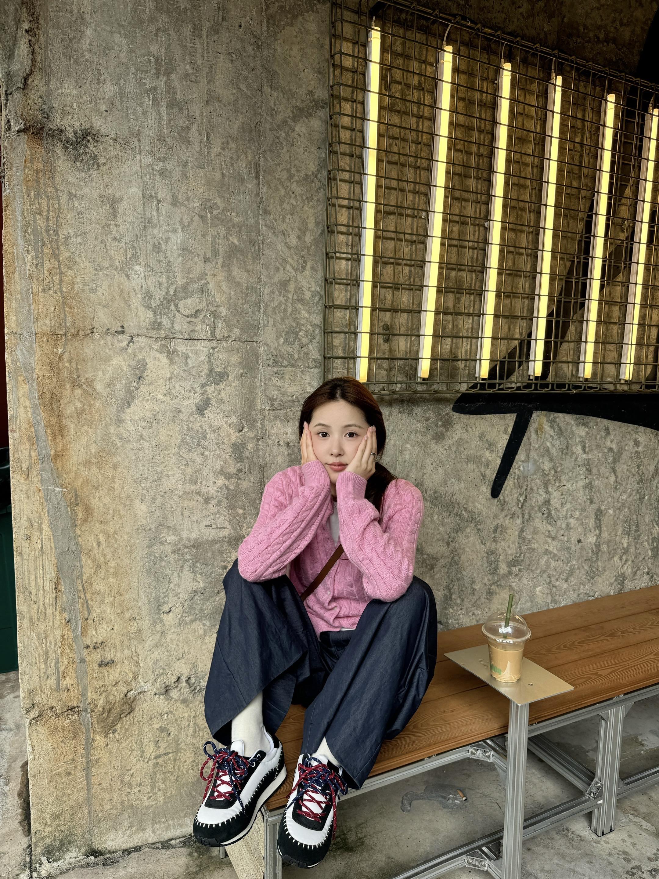 一位长相漂亮、身材出众的姑娘,穿上了一件对身材要求极高的紧身款一字肩粉色针织衫搭