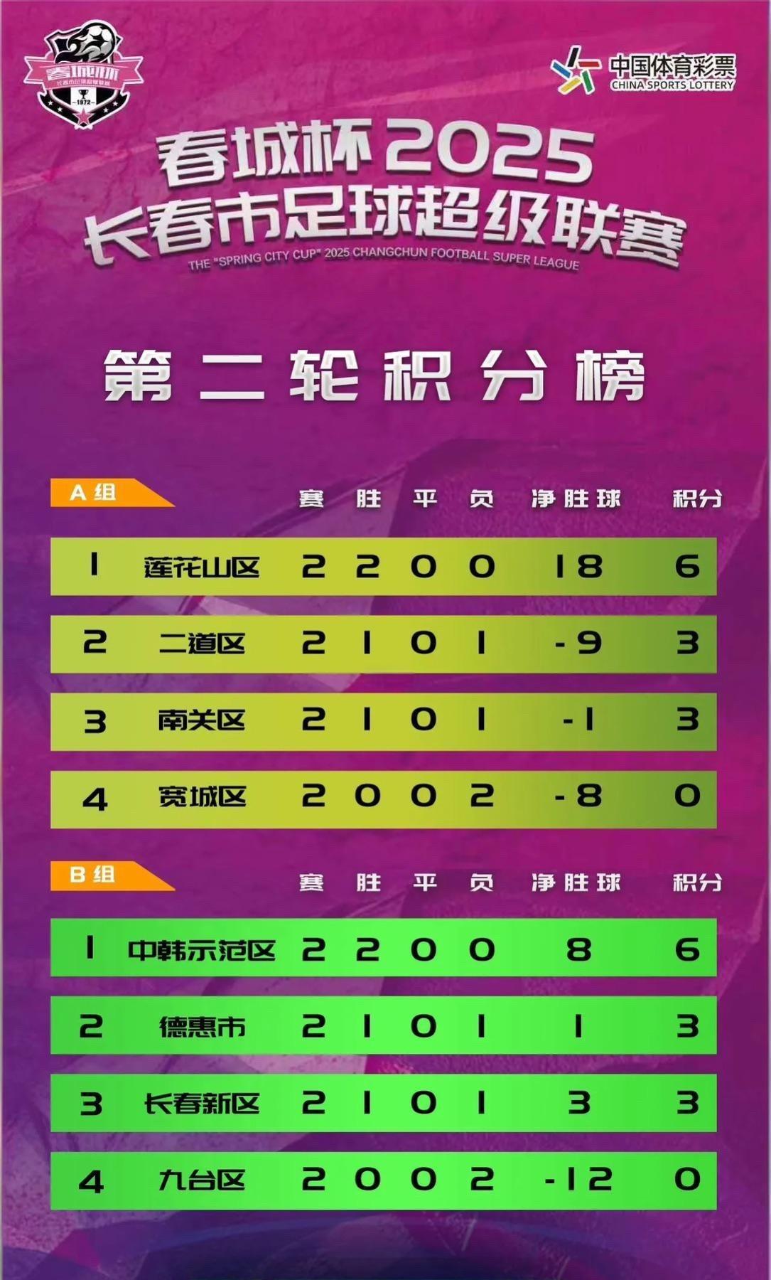 宽城区 1 : 2 南关区 莲花山区 12 : 1 二道区 中韩示范区 10 : 3 九台区 德惠市 4 : 2 长春新区 朝阳区 1 : 1(4:5)绿园区 汽开区 2 : 1 双阳区 农安县 0 : 5净月区 经开区 2 : 4公主岭市 南关区 1:3二道区 宽城区1:8莲花山区 九台区0:5长春新区 中韩示范区 1:0德惠市 绿园区7:0汽开区 双阳区3:9朝阳区 净月区3:1经开区 农安县3:1公主岭市 A小组莲花山队不负众望,以两战全胜、进20球失2球排名本小组第一,队内3号射手金成龙两轮比赛过后已经打入10球,暂居射手榜首位,成为金靴大热; B小组中韩示范区队两战全胜积6分、净胜球+8排名本组积分榜第一; C小组绿园区队1胜1平积4分、净胜球+8排名本组积分榜榜首。不知道体育局这5个积分是咋算的? D小组净月队两战两胜积6分、净胜球+7排名本组积分榜第一。