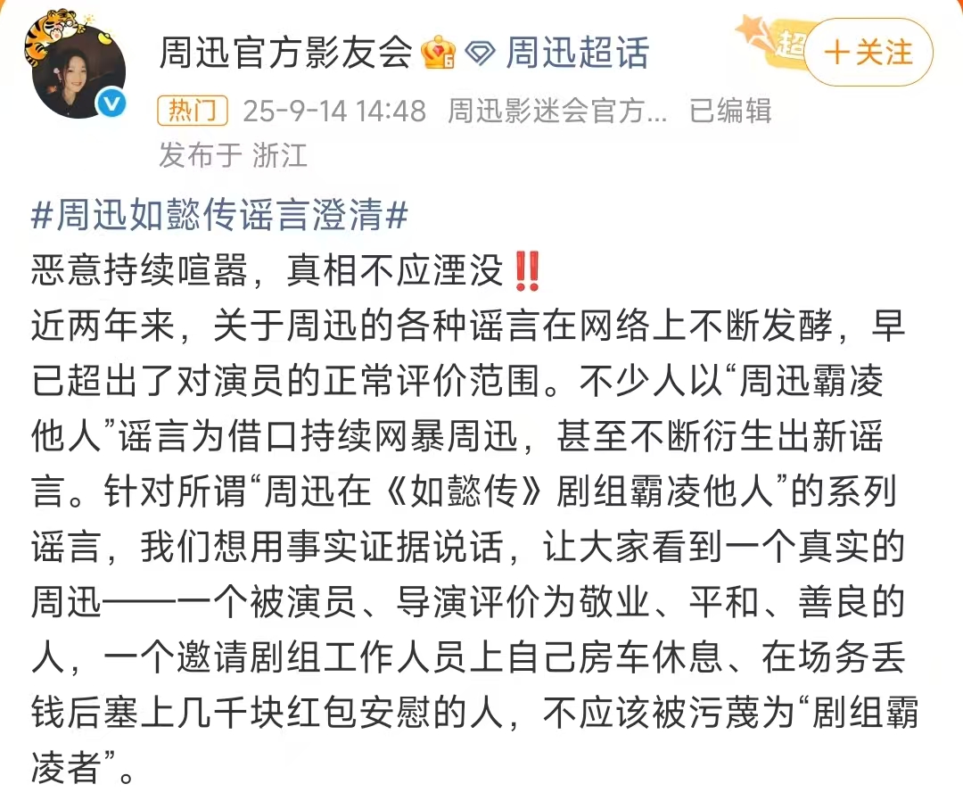 周迅澄清《如懿传》的谣言,说没有霸凌李纯;没有诅咒李纯演卫嬿婉这个角色会遭报应;没有霸凌霍建华;没有霸凌导演汪俊;没有霸凌童星。
