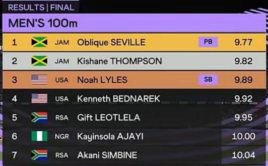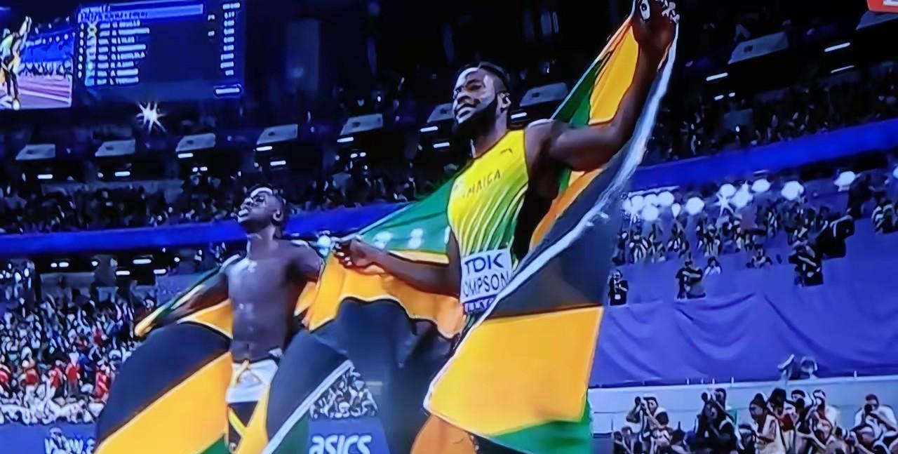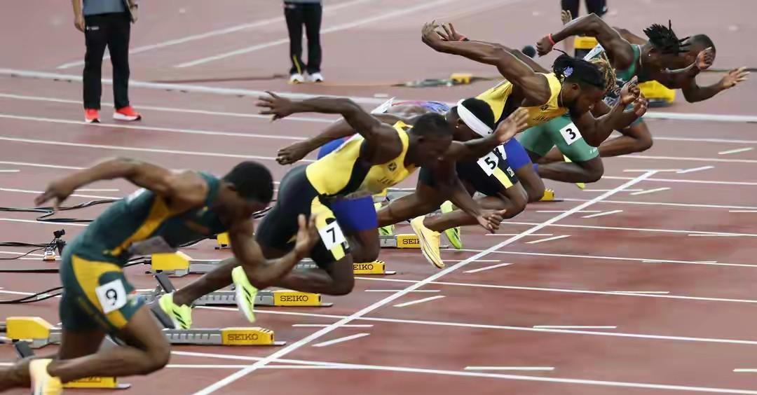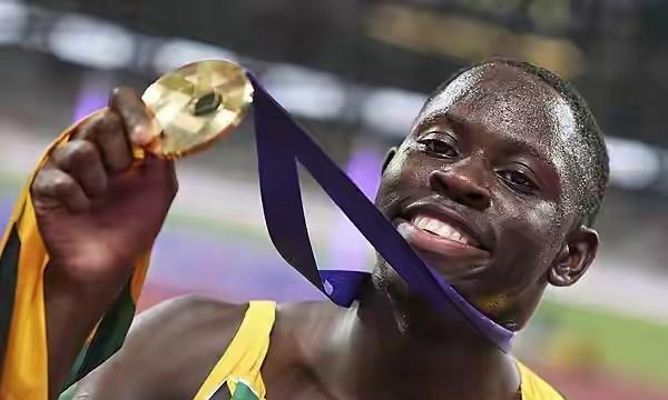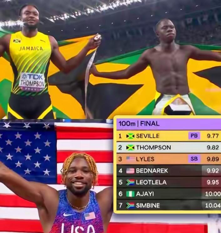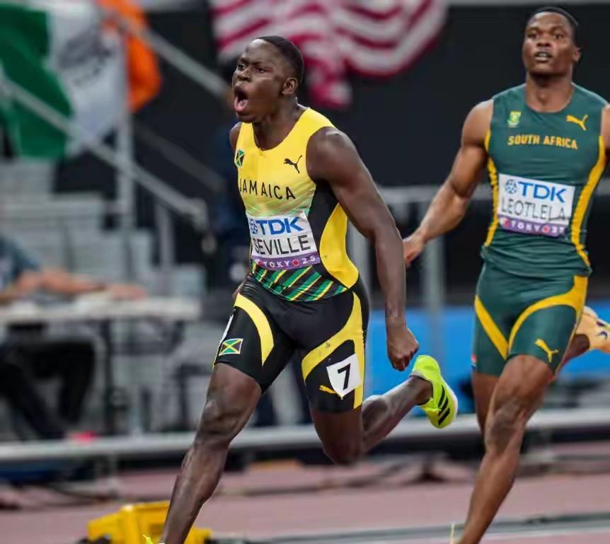 东京田径世锦赛男子100米决赛,24岁的牙买加新星奥布利克·塞维尔在看台上的前辈、世界纪录保持者博尔特的注视下率先冲过终点线,成绩定格在9秒77,让牙买加时隔十年重夺世锦赛男子百米冠军,同时,牙买加的另一位名将基沙恩·汤普森以9秒82获得了银牌,博尔特激动地与身边的同胞相拥,振臂庆祝。 这届比赛的百米飞人大战水平相当高,八名决赛选手的半决赛成绩都进了10秒,这是自2017年以来的首次,决赛虽然没能再度全体突破10秒,但获得冠亚军的两位牙买加选手的成绩相当亮眼,卫冕冠军莱尔斯以9秒89获得铜牌,第四名贝德纳雷克的9秒92和第五名莱奥泰拉的9秒95也进到在10秒以内。