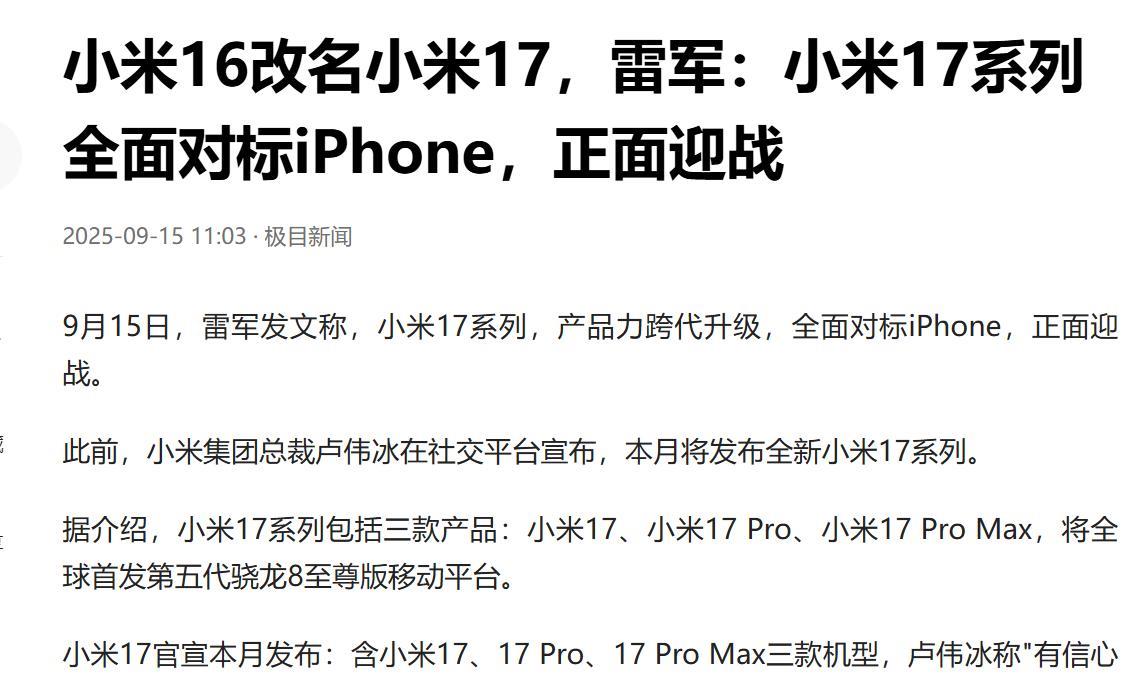 “小米16改名小米17,雷军:小米17系列全面对标iPhone,正面迎战”,这是