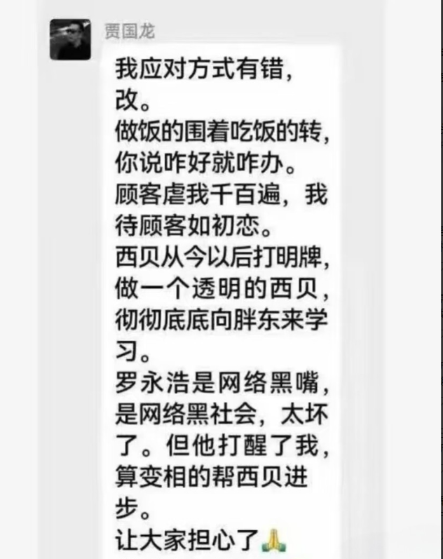 因为西贝贾国龙在行业群的发言完整版截图被爆出来了,在前面承认自己对这次预制菜风波应对方式有问题后,后面直接抨击罗永浩是网络黑嘴。