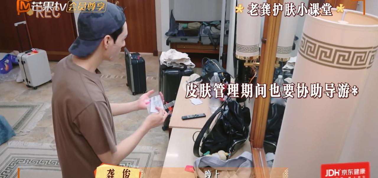 龚俊对着镜头 敷上面膜, 厕所里面的张晚意突然大喊 “哥” 龚俊哼着歌, 悠闲地敷面膜。 身在厕所的 张晚意大声喊 询问明天的行程安排。 哎,不是说好 埃及这一站的导游是张晚意吗? 怎么明天晚餐时间与参观神庙时间, 都要询问龚俊呀。 这一刻 我都搞不清到底谁是导游了。 你说, 张晚意在上厕所, 就不能出来再说吗? 他非得一个在厕所, 一个在外面, 搞个隔空喊话, 人为造成沟通障碍。 真的服了。 也许张晚意突然想到这个行程问题, 一定要知道答案, 等不及了 一定要马上问龚俊吧。 真的是太上心, 又是一个急性子。 龚俊本想好好好好敷个面膜, 差点被张晚意这一大喊吓到, 还以为张晚意在厕所怎么了。 真的这个弟弟一刻都离开不了 哥哥呀。 龚俊本想卸下“大家长”的重担,