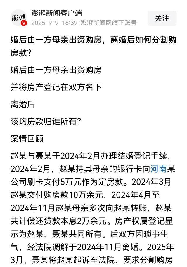 河南驻马店,小赵和妻子结婚后,由母亲出资为他们按揭了一套房子,产权登记为小赵和妻子共有。谁知两人刚结婚9个月就过不下去了,最终经调解离婚。离婚4个月后,前妻突然起诉小赵,要求分割小赵母亲给他们买的那套房子。 小蔡是上蔡县人,以前和女子聂某是男女朋友关系。 因为年纪不小了,小赵的母亲非常操心他的婚事。所以,在聂某提出买房的诉求后,小赵的母亲一口就答应了下来。 二零二四年二月份,在双方父母的催促下,小赵和聂某办理了结婚登记手续。领了结婚证后,小赵就拿着母亲的银行卡刷了5万元定下了一套房。 三月份,小赵又用母亲的钱付了10万余元按揭了一套房子。从四月份起,小赵的母亲每个月转给他3000余元还房贷。 原本小赵的母亲以为,自己替儿子操持完终身大事,以后可以喘口气歇一歇了,可谁知,儿子小赵和儿媳聂某相处并不愉快。 两人婚后经常因为鸡毛蒜皮的小事吵架,小家里每天鸡飞狗跳,小赵的母亲每天有断不完的官司。 原本小赵和妻子聂某感情还算不错,可是在气头上时,两人难免说难听话,吵架次数多了,两人感情也吵没了。 短短半年时间,小赵和妻子就闹到了离婚的地步,最终爱人变仇人,两人对簿公堂。11月份,经过调解二人离婚。 原本小赵以为此事到此为止了,可离婚后,聂某称,他们婚后买的房子写了她的名,就应该分给她一半,小赵应该折价分给她一半买房款。 因为双方没谈拢,离婚四个月后,聂某将小赵起诉了,要求分割买房款。 那么,本案从法律角度应该如何分析?聂某能否要求分割房产? 1、小赵母亲出钱买房,产权登记在小赵和聂某名下,这种行为实际上属于赠予,房子应属于夫妻共同财产。 《民法典》第六百五十七条规定,赠与合同是赠与人将自己的财产无偿给予受赠人,受赠人表示接受赠与的合同。 小赵和聂某结婚前,聂某提出小赵家要买一套城里的房子,小赵母亲出资为他们买房,并登记在小赵和聂某名下。 小赵母亲的行为,应当视作对儿子儿媳的赠予。 根据《最法关于适用〈民法典〉婚姻家庭编的解释(一)》第二十九条规定:当事人结婚后,父母为双方购置房屋出资的,依照约定处理;没有约定或者约定不明确的,按照民法典第一千零六十二条第一款第四项规定的原则处理。 民法典第一千零六十二条第一款第四项表明,夫妻在婚姻关系存续期间继承或者受赠的财产,原则上属于夫妻共同财产,但遗嘱或者赠与合同中确定只归一方的财产除外。 小赵母亲在小赵和聂某领取结婚证后,出资为他们买房,产权登记为小赵和聂某共有,且并没有明确约定该出资是对小赵一方的赠与。 所以从法律角度看,这套房子属于小赵和聂某在婚姻关系存续期间受赠所得的财产,应认定为夫妻共同财产。 2、小赵的母亲虽然将房子赠予给了小赵和聂某,但并不意味着聂某可以要求分割买房款。 《最高法关于适用〈民法典〉婚姻家庭编的解释(二)》第八条规定:婚姻关系存续期间,夫妻购置房屋由一方父母全额出资,如果赠与合同明确约定只赠与自己子女一方的,按照约定处理;没有约定或者约定不明确的,离婚分割夫妻共同财产时,可以判决该房屋归出资人子女一方所有,并综合考虑共同生活及孕育共同子女情况、离婚过错、对家庭的贡献大小以及离婚时房屋市场价格等因素,确定是否由获得房屋一方对另一方予以补偿以及补偿的具体数额。 也就是说,小赵母亲在买房过程中,承担了全部出资责任,包括支付定金、首付款以及每月的房贷。 房子虽然是由小赵母亲出资,但房子的性质为小赵和聂某的夫妻共同财产。可如果判房子分给聂某一半,显然对小赵及小赵的母亲不公平。 因此,房子会判归小赵所有,但会根据具体情况,判断是否需要给聂某一定的经济补偿。 最终,经审理认为,根据小赵提供的银行流水及转账记录,可以证明房子是由小赵母亲出资买的。 小赵的母亲买房写小赵和聂某的名,是为了给儿子小赵创造更好的生活条件,增加他婚后的生活质量。 聂某虽然和小赵结婚,但是两人共同生活时间较短,且两人没有孩子。 因此,综合房子的出资情况,以及小赵母亲赠予的目的,根据公平原则,判房子归小赵所有,酌定小赵补偿聂某2万元。 案例来源:驻马店中院,澎湃新闻客户端
