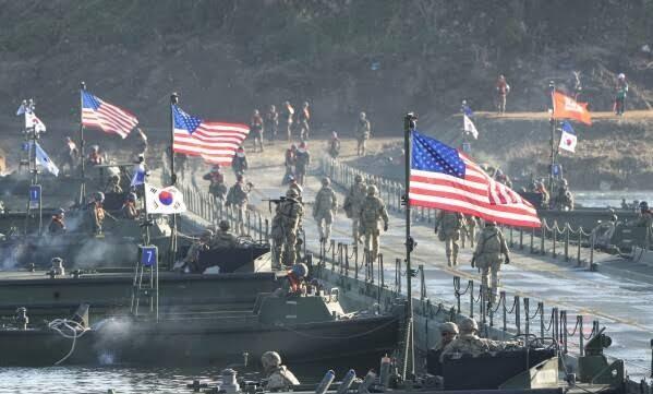 被中国阅兵吓到了?美日韩启动军演,军舰开进东海,兵推“核反击计划”,剑指中朝 当地时间15日,在东海海空域、韩国济州岛东部及南部,美日韩三国启动了为期5天的“自由之刃-25”大型军演。 据悉,日方将出动700名自卫队队员,以及“日向”号、“羽黑”号驱逐舰参演和多架战机参加演习,美韩则没有披露参演人数和装备,但应该会有军舰甚至是核潜艇开进东海。而演习内容,则包括了提高弹道导弹防御能力、防空演习、医疗后送训练、海上拦截行动训练等,还要进行机舰同框的列队摆拍。 同时,美韩还将同步举办“钉锤”桌面兵推,推演韩国在遭遇核攻击后,要如何将美军的核能力和韩国的常规能力整合在一起,发动全面的核反击和常规反击。 很明显,这次美军牵头在中朝周边展开军演,假想的演习背景就是中朝对日韩展开了进攻。看来,中国的阅兵,可能把这三国吓得不轻。 以下均为资料图。