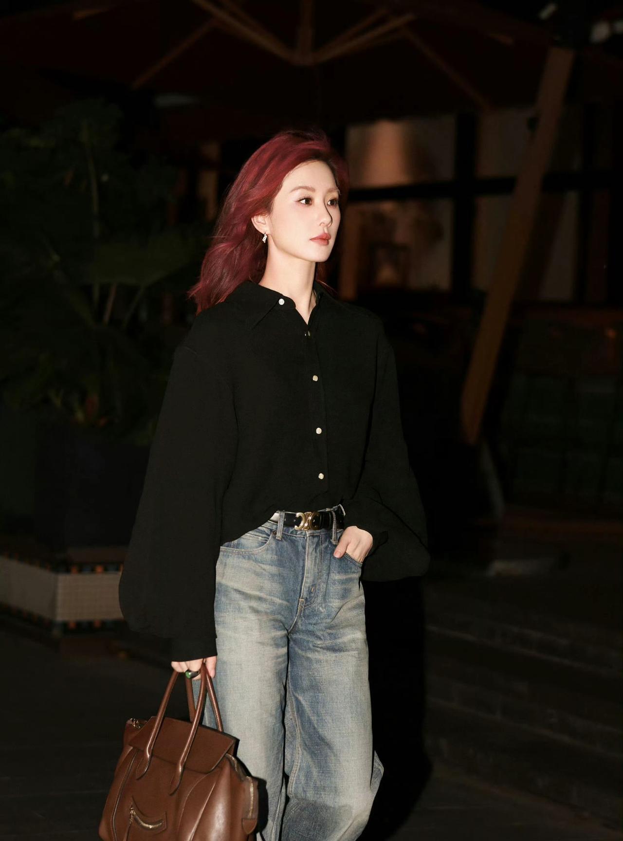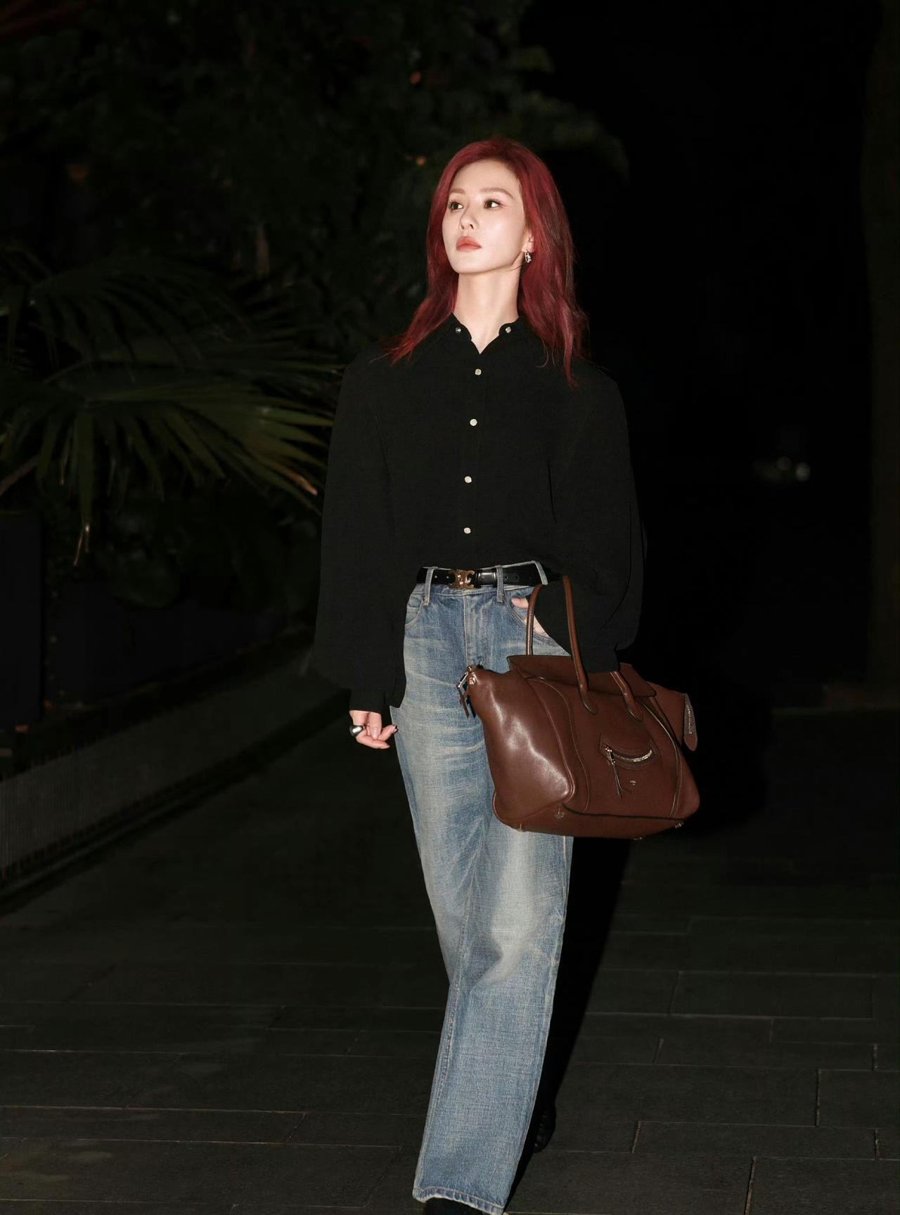 #刘诗诗#夜晚的随性松弛感被拿捏住~黑衬衫搭配做旧阔腿牛仔裤,棕色包包增添复古质感,红发在暗光里也很吸睛,简单却很有腔调的一套。