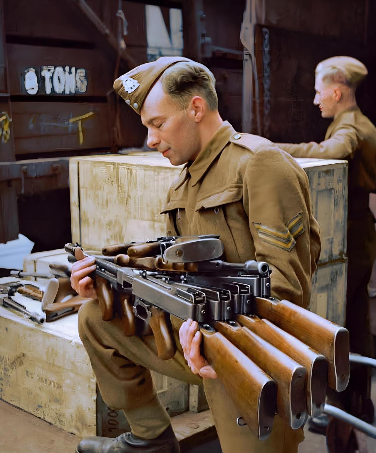 照片上这是哪一种型号的汤普森冲锋枪? 1942年3月23日,二战时期,照片上是英军通过“租借法案”从美国运抵的汤普森冲锋枪。英军士兵在中部地区的军械库内清点、搬运枪支。 汤普森冲锋枪有多种型号,在二战最常见的有M1928/M1型的枪总重量为4.78千克(约9.6斤),采用11.43毫米口径子弹。M1A1型的空枪重4.78千克(约9.6斤),全枪长811毫米,那么照片上这是哪一种型号的汤普森冲锋枪? 在搬运中这个英军士兵臂力真有那么大吗?我不相信他一次性能托着7支近70斤的冲锋枪搬运到武器库。#牢记历史爱我中华# #分享真实的历史#