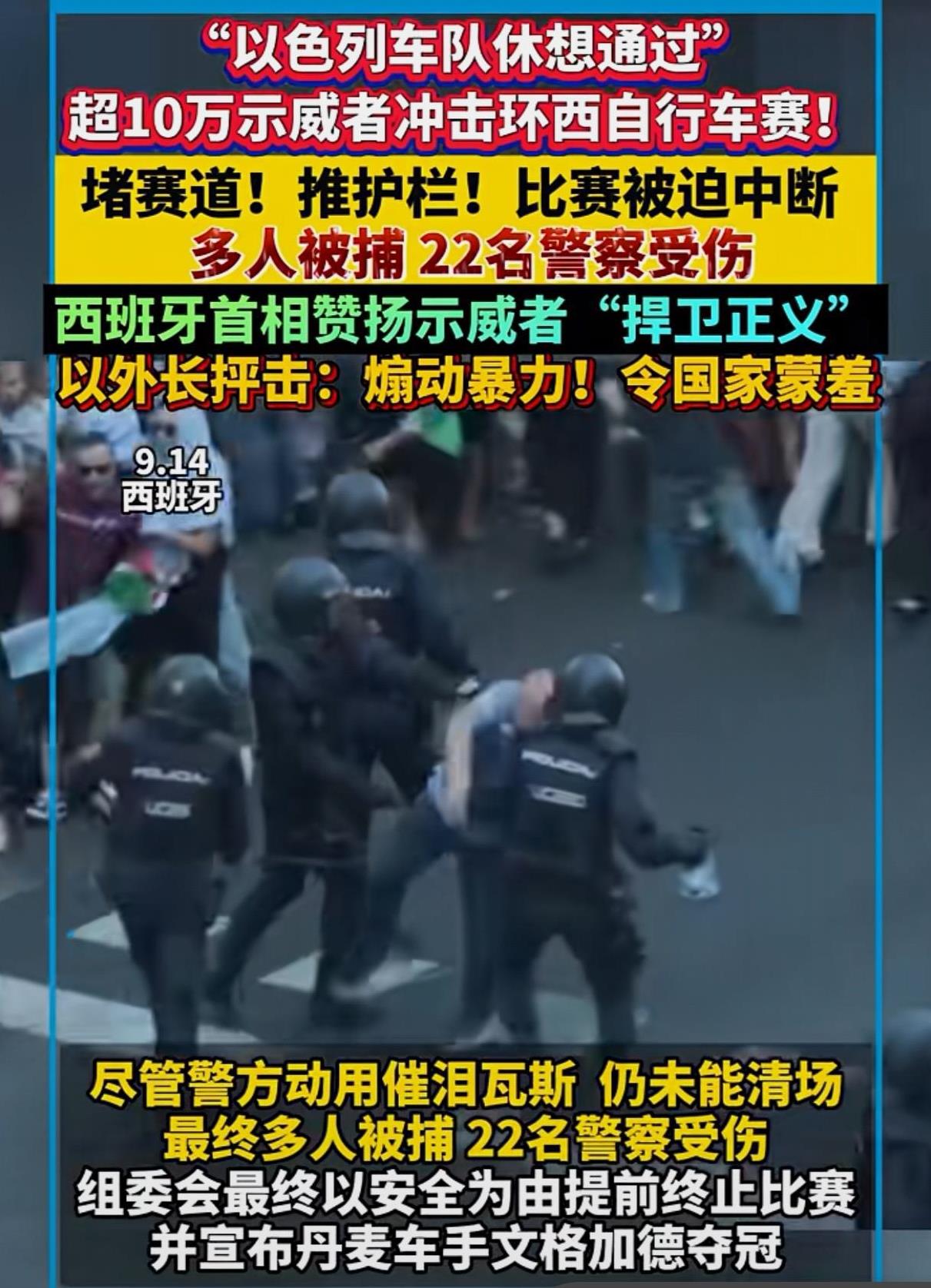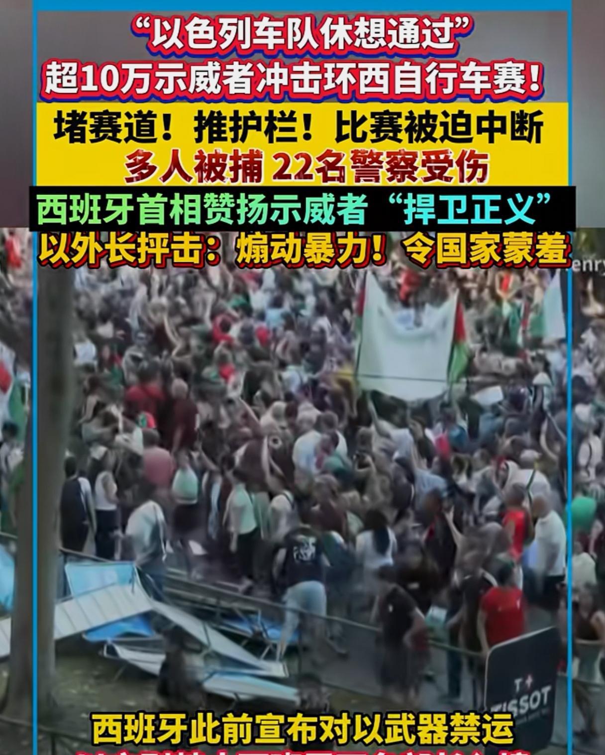 西班牙政府和人民对以色列说不!超10万抗议者冲击环西自行车赛!愤怒的人群他们堵塞道!推护栏!比赛逼迫中断。有媒体报道:“西方终于有国家站在了正义一边”! 西班牙首相公开赞扬示威者“为正义事业挺身而出”,“捍卫正义”。引发以色列强烈不满,而且以外长大言不惭竟然抨击西班牙首相:“煽动暴力,令国家蒙羞”。