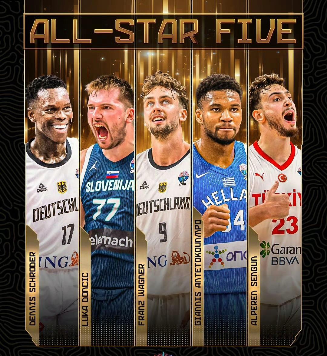 男篮欧洲杯决赛,德国88-83击败土耳其队夺得冠军。最佳阵容全是NBA球星:东契