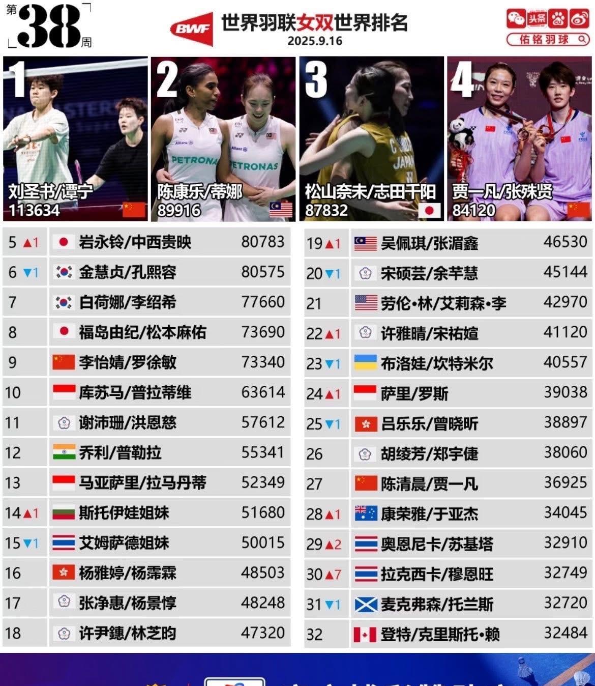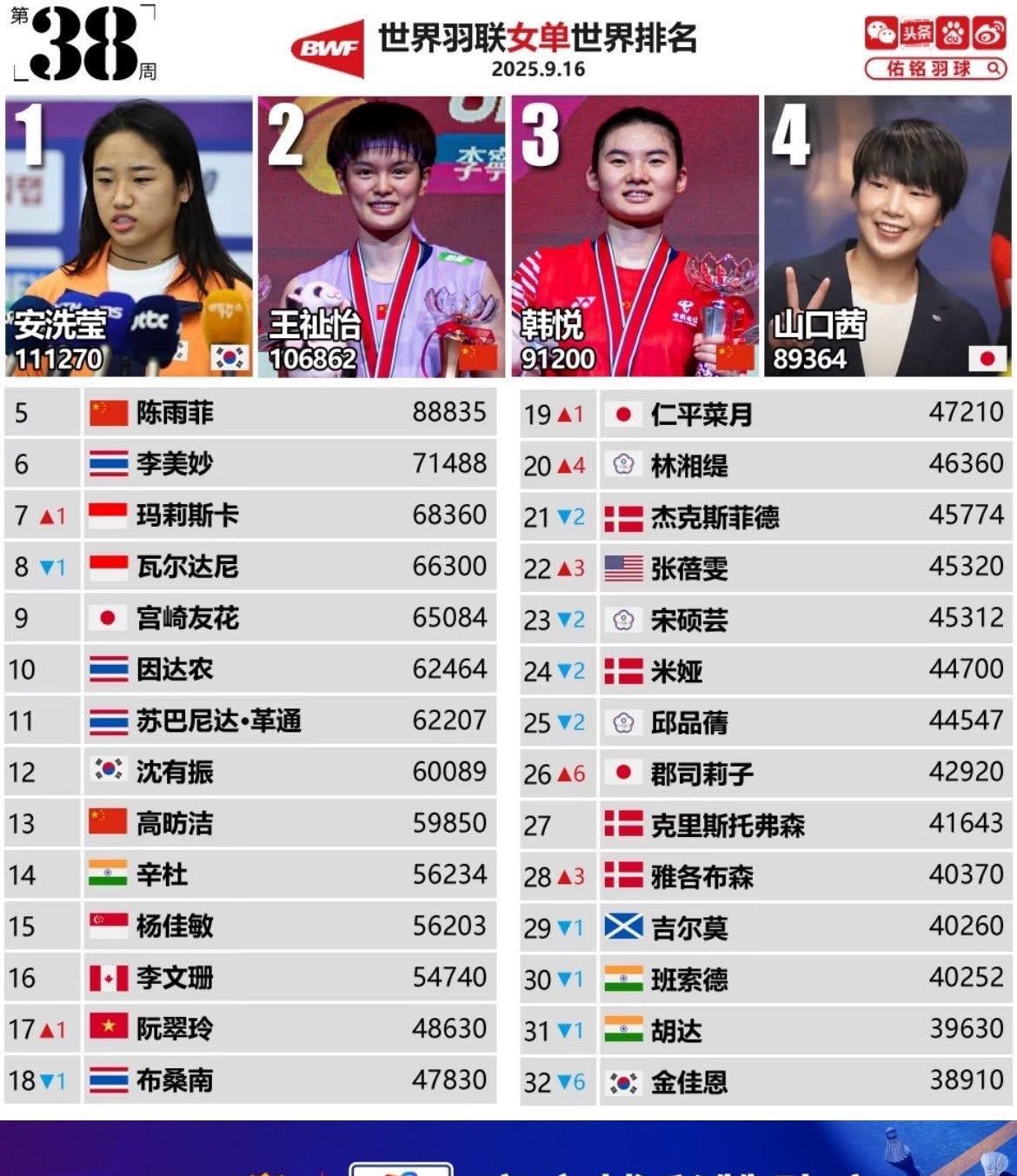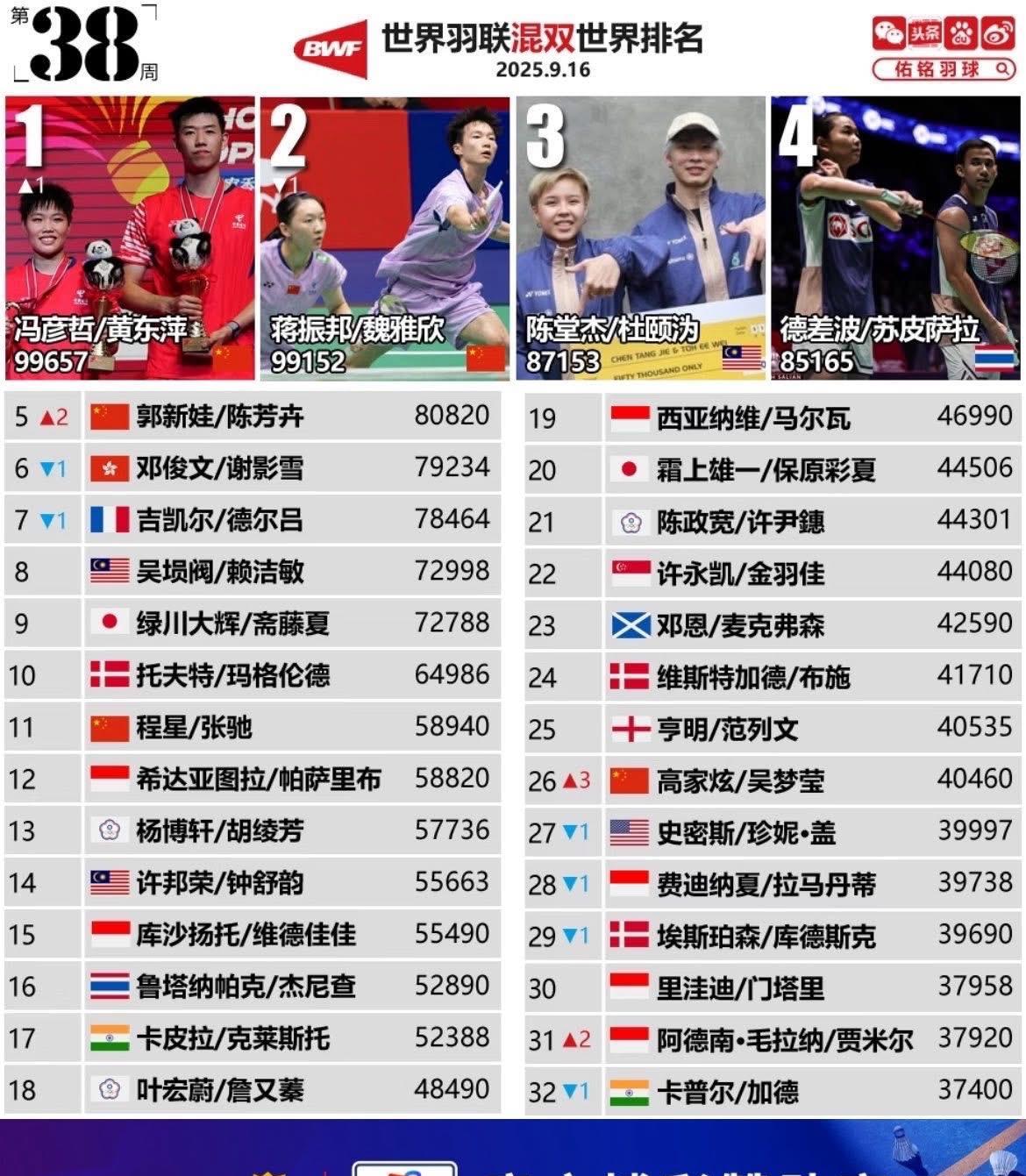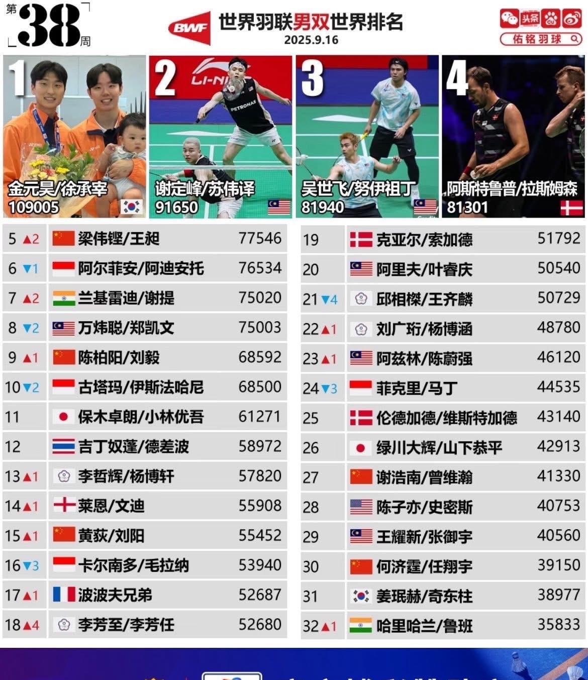 世界羽坛最新排名:男单、女单、男双、女双、男女混合.(2025年9月16日)