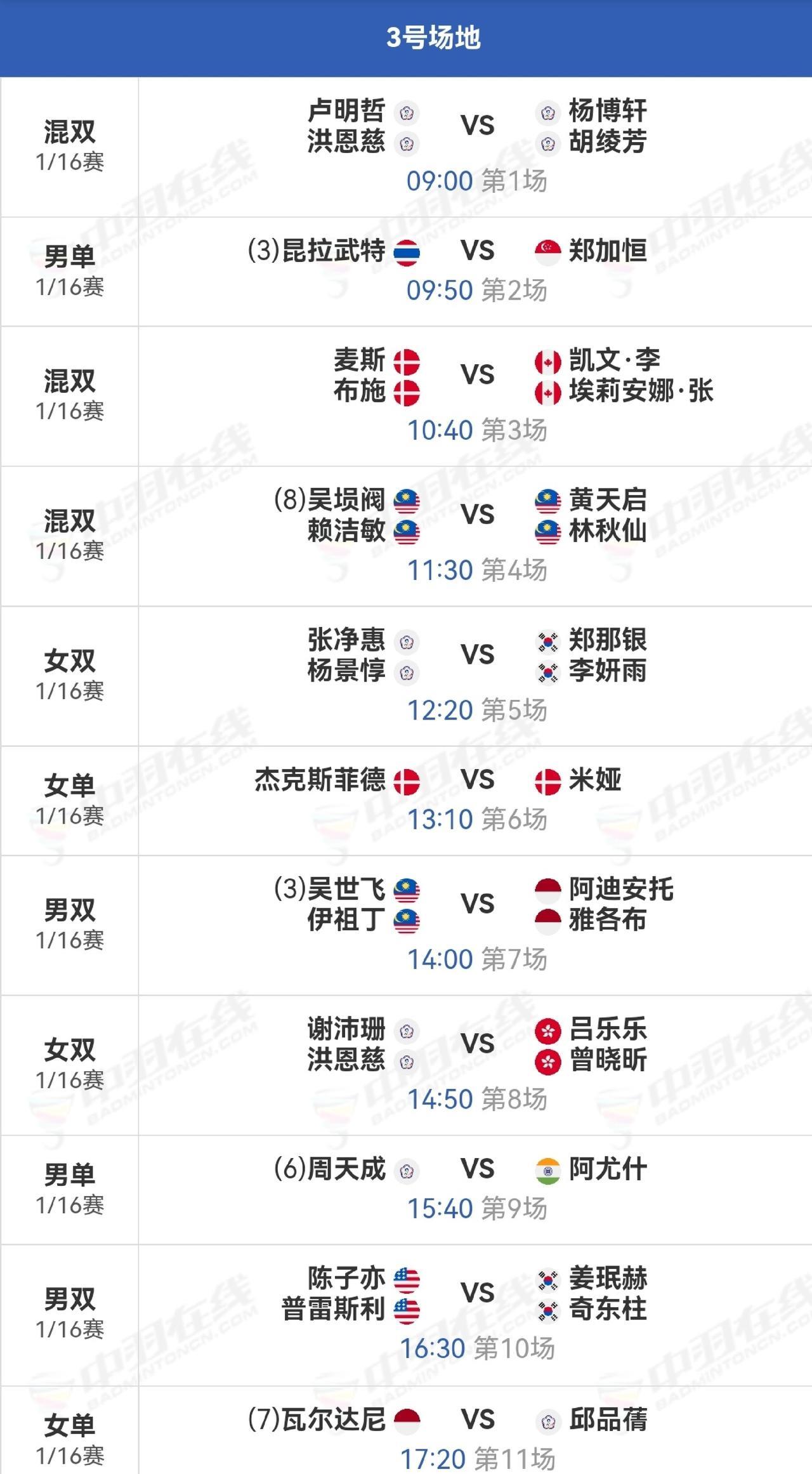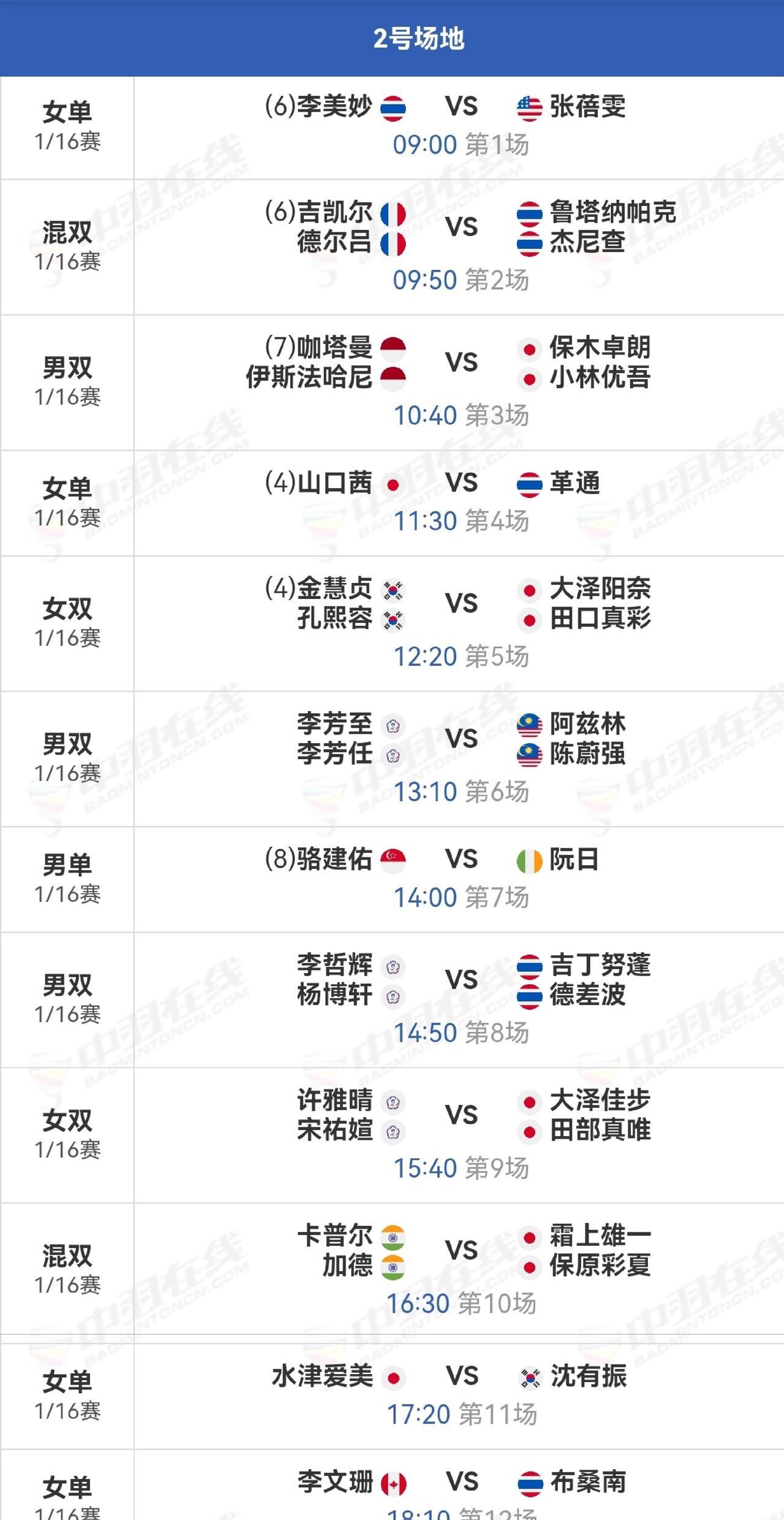 2025年中国羽毛球大师赛,石宇奇未参赛。1/16赛翁泓阳对阵奈良岗功大,陆光祖对阵渡边航贵,陈柏阳/刘毅对阵金元浩/徐承宰,黄荻/刘阳对阵阿尔菲安/菲克里。