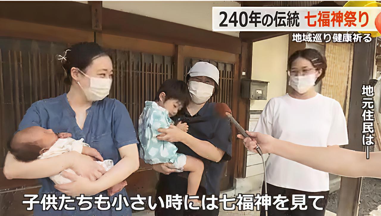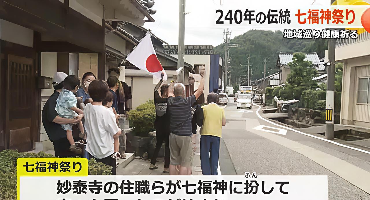 日本福井举行传统“七福神祭” 9月15日,延续240 年的传统活动“七福神祭”在日本福井县南越前町举行。 “七福神祭”起源于1782年开始持续五年的“天明饥荒”。当地的妙泰寺住持和村民们装扮成七福神,围绕当地居民房屋巡游,祈求五谷丰登和身体健康。 这次装扮成七福神的是由当地居民组成的保护协会的成员。他们坐上卡车从寺庙出发,居民们纷纷在家门前等待“七福神”的到来。 一位抱着孩子观看的人说,“我小时候一看到七福神就被吓哭,他们伴随着我的成长,我希望我的孙子们也会这样。 当天七福神花了2小时巡游后返回妙泰寺时,寺庙内已经有很多当地居民。“七福神”下车在寺庙内与孩子们互动,以此祈求五谷丰登和孩子们身体健康。