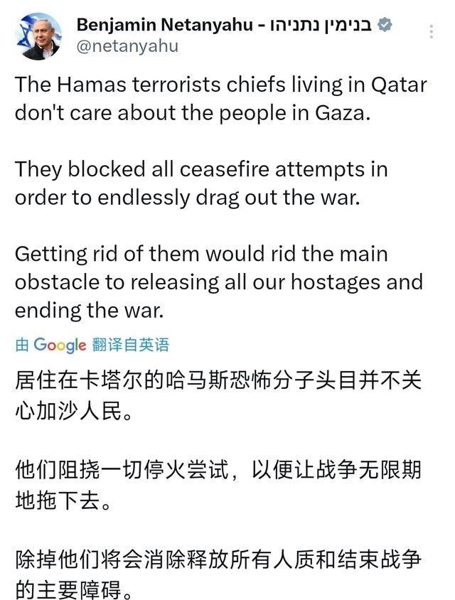以色列总理内塔尼亚胡:“居住在卡塔尔的哈马斯恐怖分子头目并不关心加沙人民。他们阻挠一切停火尝试,以便让战争无限期地拖下去。除掉他们将会消除释放所有人质和结束战争的主要障碍。” 以色列总理内塔尼亚胡在2025年9月13日通过社交媒体发布这条声明,指责哈马斯高层在卡塔尔不顾加沙居民利益,拒绝各种停火方案,想让冲突一直持续下去。他说除掉这些人就能清除释放人质和结束战争的最大阻碍。这话背景是加沙战事陷入僵局,哈马斯政治局成员如哈利勒·阿尔-哈亚和穆萨·阿布·马尔祖克长期住在多哈,享受外交保护和资金支持。情报显示他们否决了多项提议,包括美国推动的交换人质和解除武装计划。 内塔尼亚胡的观点是这些领导人优先保住权力,而不是改善加沙民生,他们通过卡塔尔渠道转移资源建军事设施,而不是民生项目。这声明发布后,引发国际分歧,一些国家认可以色列自卫权,其他国家批评其激进行动。哈马斯回应说以色列才是破坏谈判的元凶,坚持原有条件如全面停战和建国。卡塔尔作为调解方,谴责以色列侵犯主权,重新评估角色。美国发言人表示理解消灭哈马斯目标,但质疑袭击地点。沙特也指责违反国际规范。 这个声明不是孤立的,早前内塔尼亚胡就批评卡塔尔支持哈马斯,甚至称其比其他调解国更成问题。他的财务部长更直白,说卡塔尔资助恐怖主义。冲突中,以色列多次指责哈马斯拖延谈判,比如2024年3月哈马斯回应不包括活人质名单,导致以色列不派团去开罗。2024年5月,以色列抱怨美国没提前告知谈判细节,觉得被背刺。 2024年6月,美国国务院发言人把停火障碍全推给哈马斯,尽管以色列内部官员包括内塔尼亚胡称某些协议是死路一条。2025年1月,内塔尼亚胡拒绝内阁讨论人质协议,指责哈马斯反复。2025年3月,以色列延长停火但没收到人质,哈马斯拒绝提案。这些积累让内塔尼亚胡的声明显得是长期不满的延续,但也暴露谈判双方的互不信任。