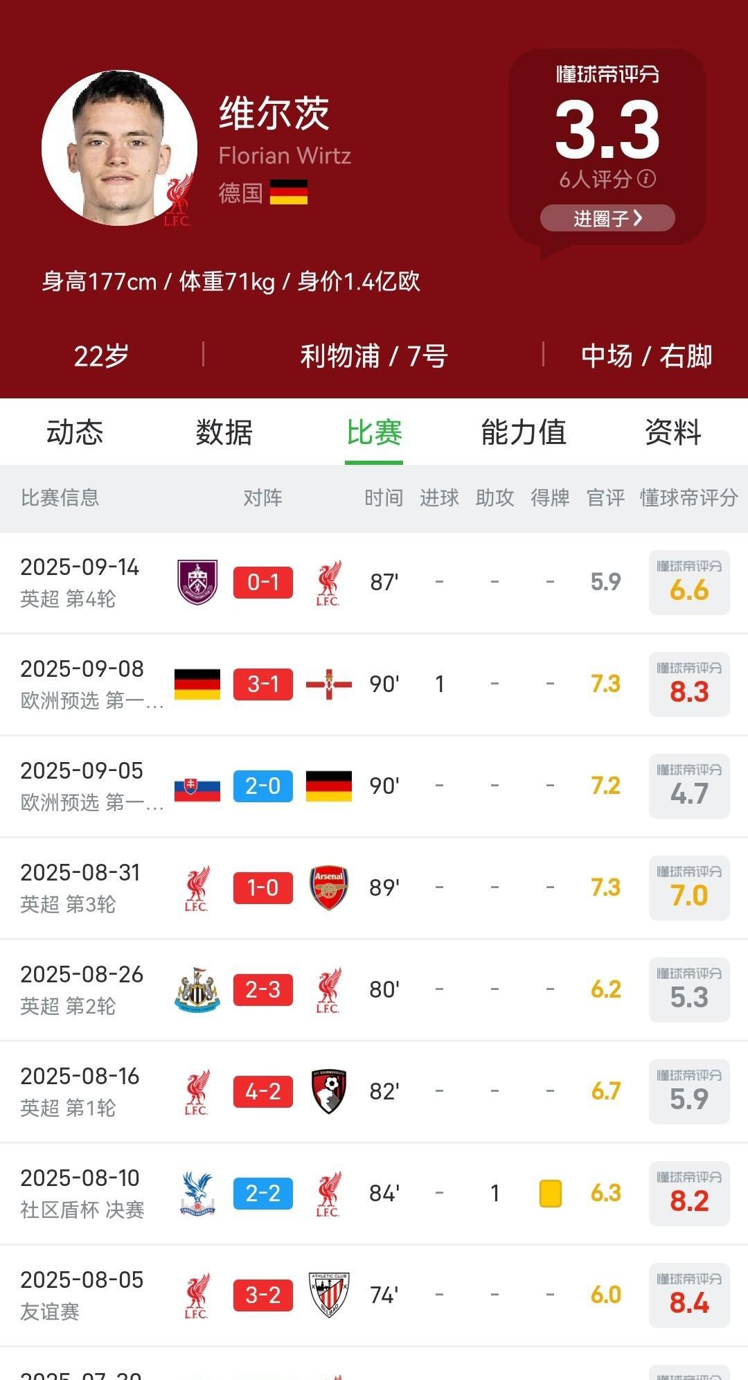 维尔茨4场联赛0球0助不会是水了吧?一个多亿不会就这么打水漂了吧? 那些说维尔茨已经踢的很好的护犊子的放弃幻想吧。1.25亿的球星踢成这样,“水”得还不够明显吗?他这小身板很难适应英超的,记得对阵纽卡的比赛一推就倒。 虽然维尔茨拿球摆脱、盘带过人、穿针引线、无球跑动这些数据还可以,但是身体对抗是最大的劣势。 我建议维尔茨还是适当的增肌吧,提高核心力量才能在英超证明自己,增肌练到有个80%沙奇里那样身材就行了。 最后还是希望维尔茨能在红军踢出来打我的脸吧。
