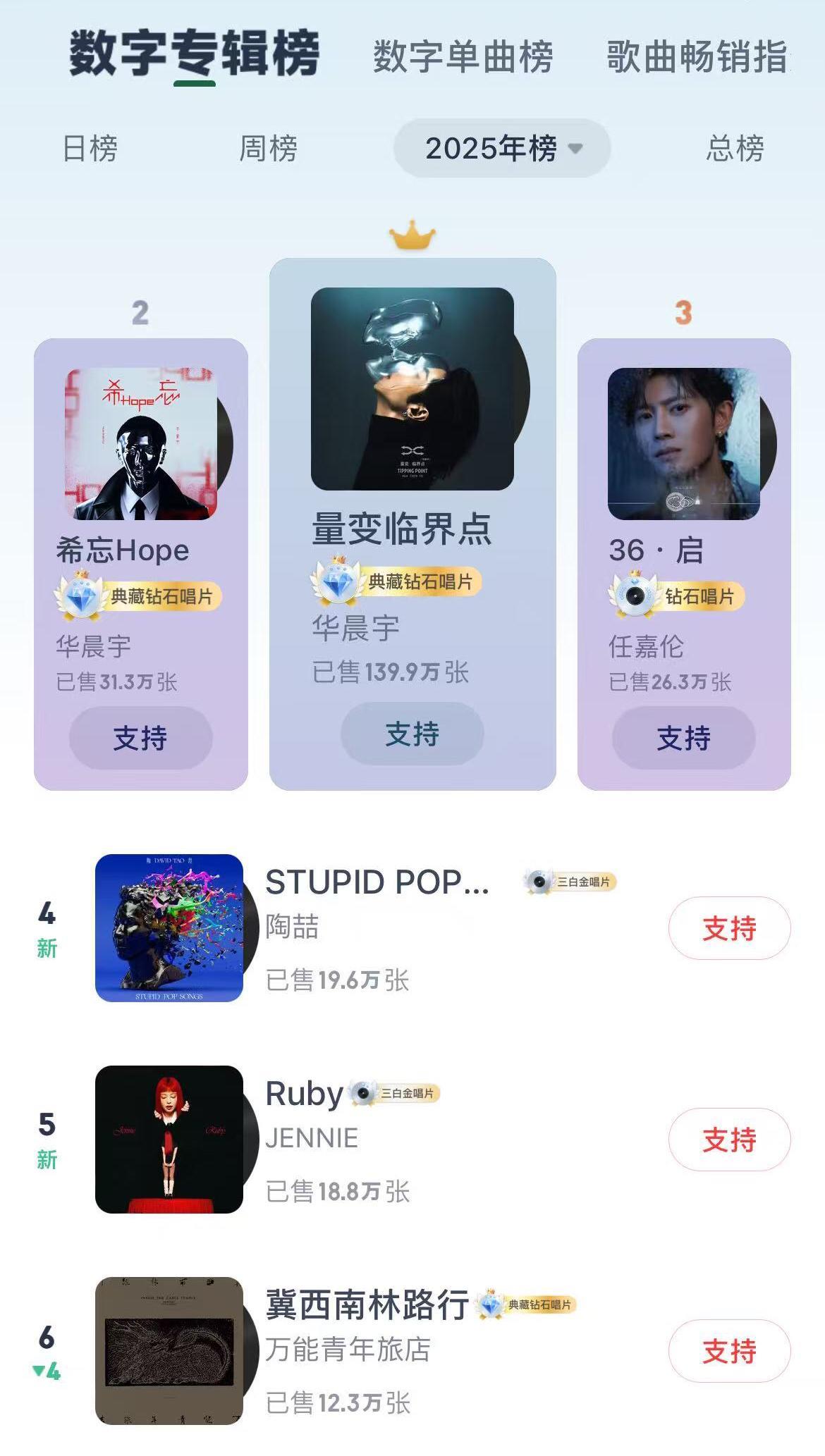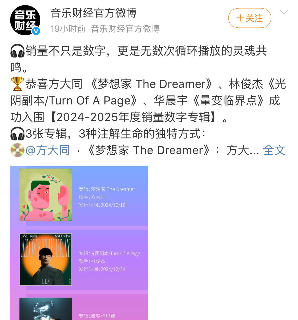 2024——2025年度华语音乐数字专辑评选前三出炉! 三张专辑分别为: 华晨宇——《量变临界点》2025年1月发行 林俊杰——《光阴剧本》2024年12月发行 方大同——《梦想家》2024年10月发行 恭喜以上三位创作歌手的优质专辑,品质,风格,销量全面开花,实至名归!
