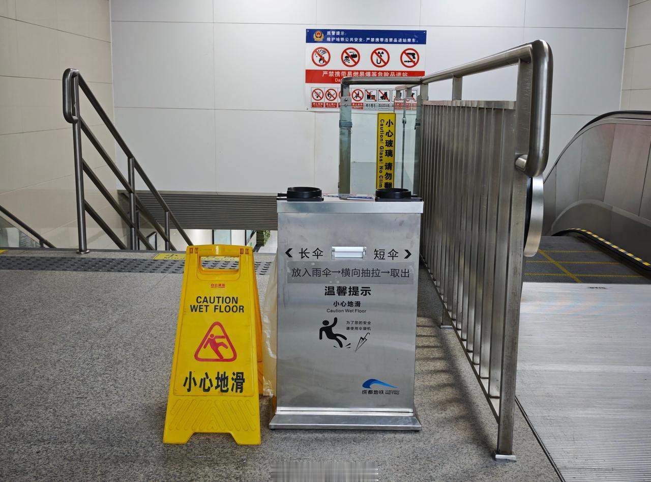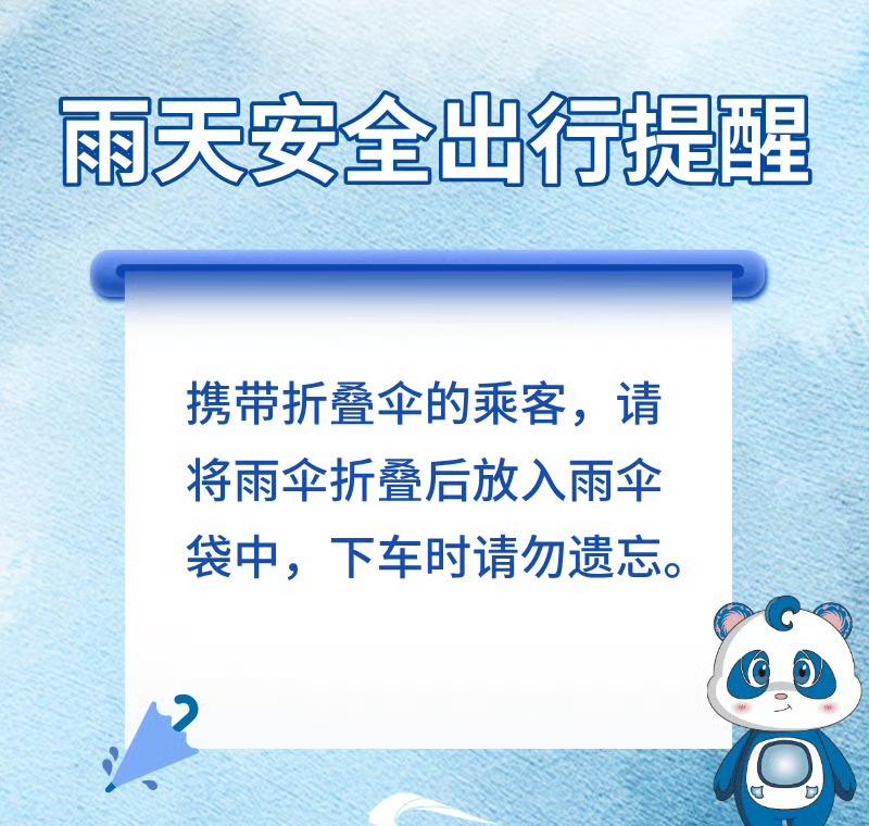 雨天出行请注意安全,如需帮助可联系工作人员或拨打服务热线028-61638000,成都地铁竭诚为您服务。