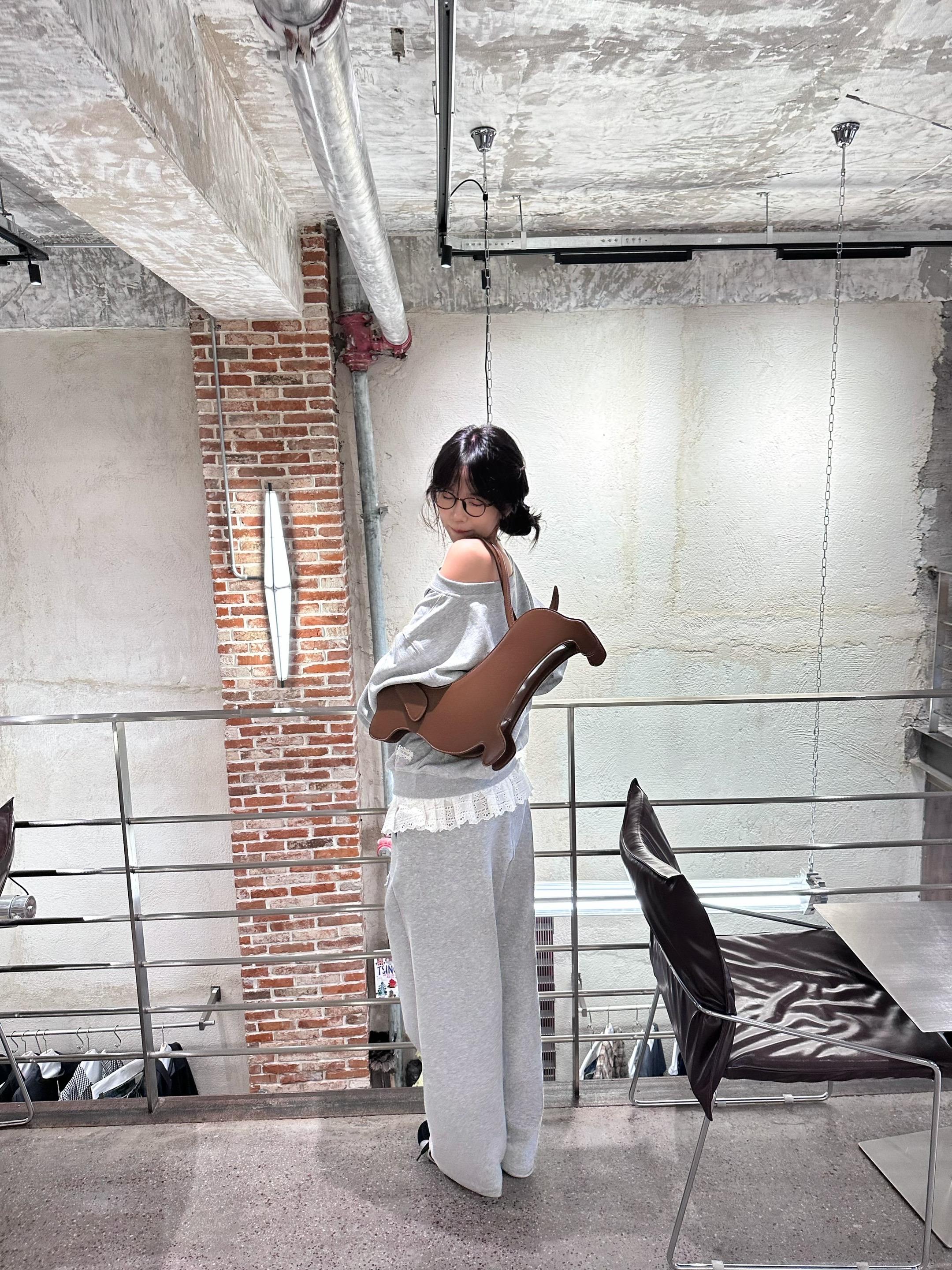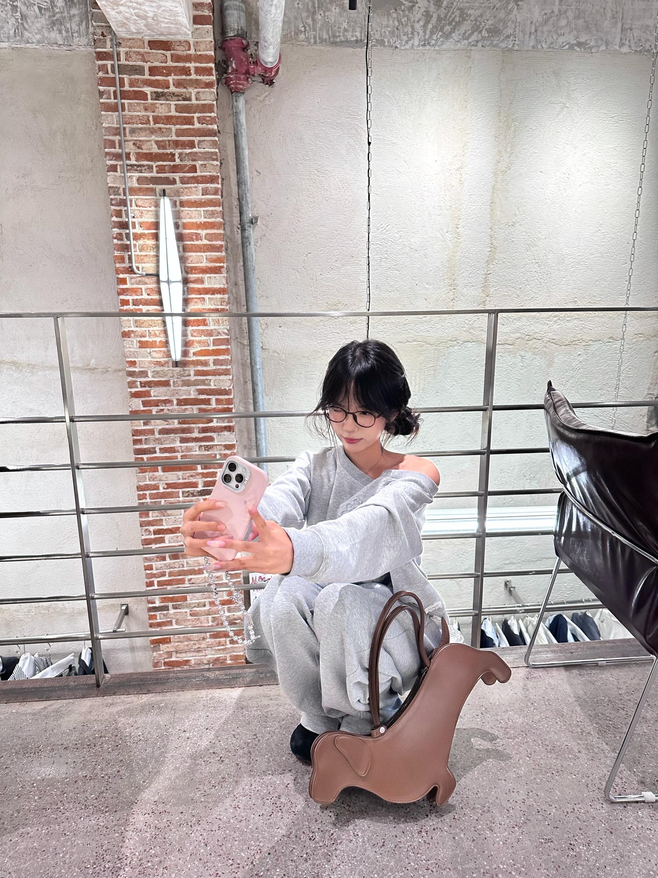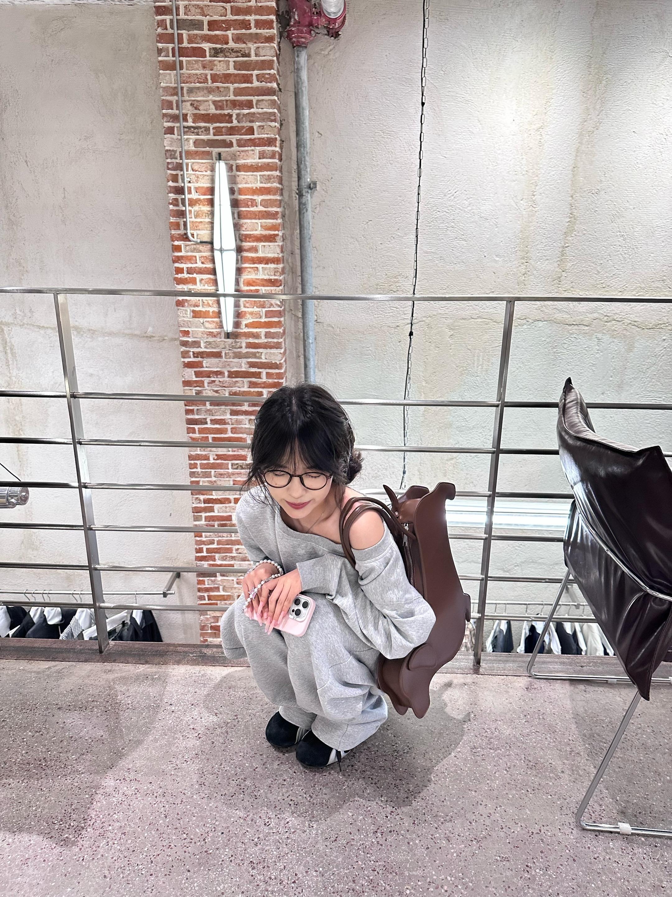 一位长相漂亮、身材出众的姑娘,穿上了一件对身材要求极高的紧身款一字肩粉色针织衫搭