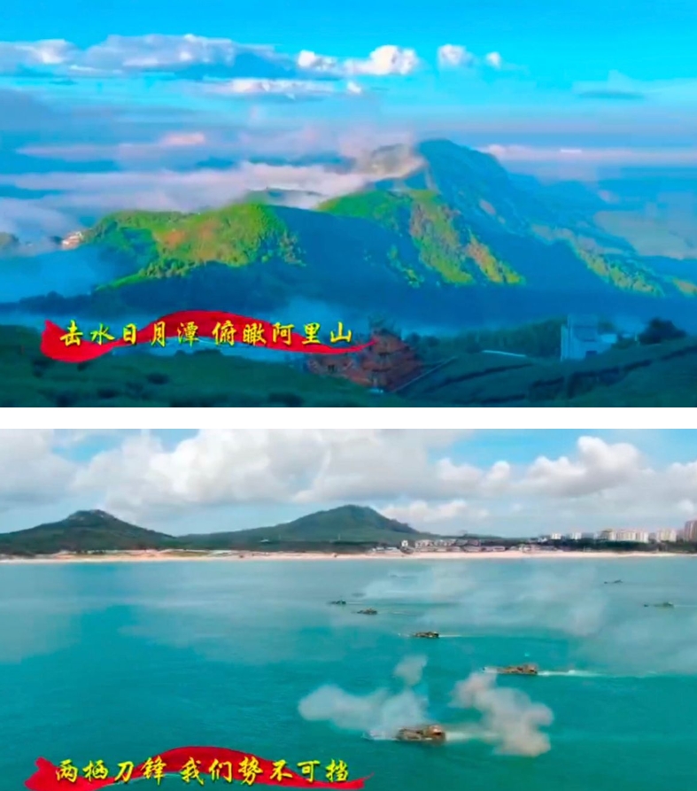 MV开头是秦军一统天下、百万雄师过大江、解放军演练抢滩登陆的画面,呼应中国人在古代、现代、当代三个时期对祖国统一的追求。而歌词唱着我们对收复台岛的必胜信念,画面则配有歼-20主弹舱发射空空导弹、191箱式火箭炮发射战术导弹、两栖登陆演习、阅兵场上展示武器装备等,还有台北101、日月潭、阿里山等地标性建筑物和景观。