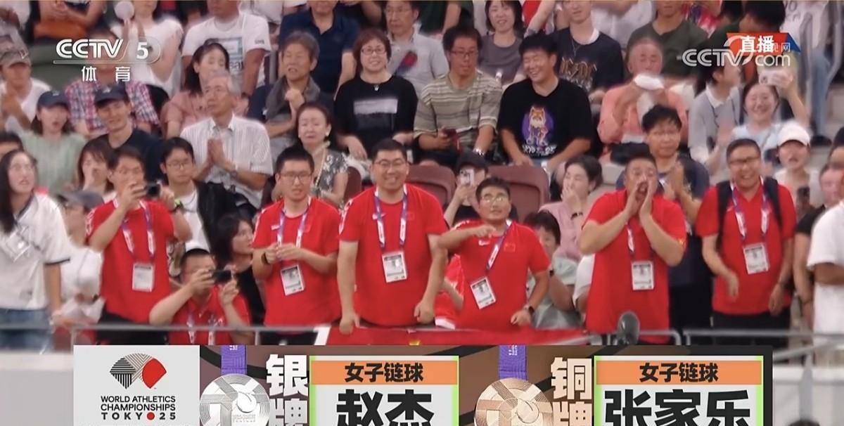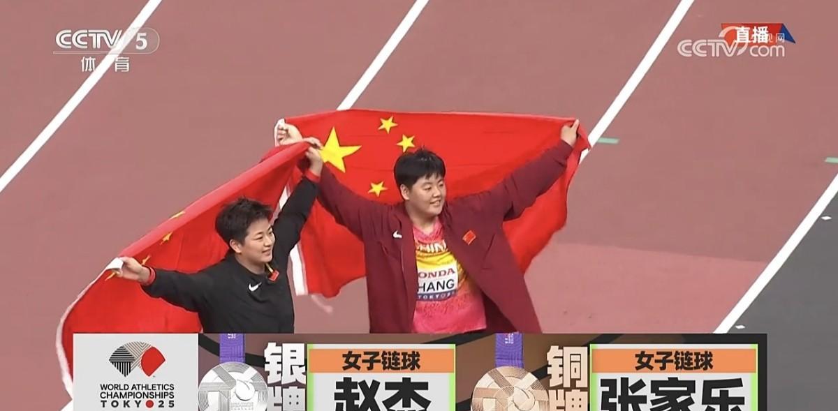 祝贺!赵杰和张家乐分获世界田径锦标赛女子链球银牌和铜牌! 今晚,在2025年东京世界田径锦标赛女子链球决赛中,巴黎奥运会铜牌得主、中国的赵杰以77.60米的成绩获得银牌,第一次参加田径世锦赛的中国18岁小将张家乐以77.10米获得铜牌。 12年来,中国女子链球再创佳绩!