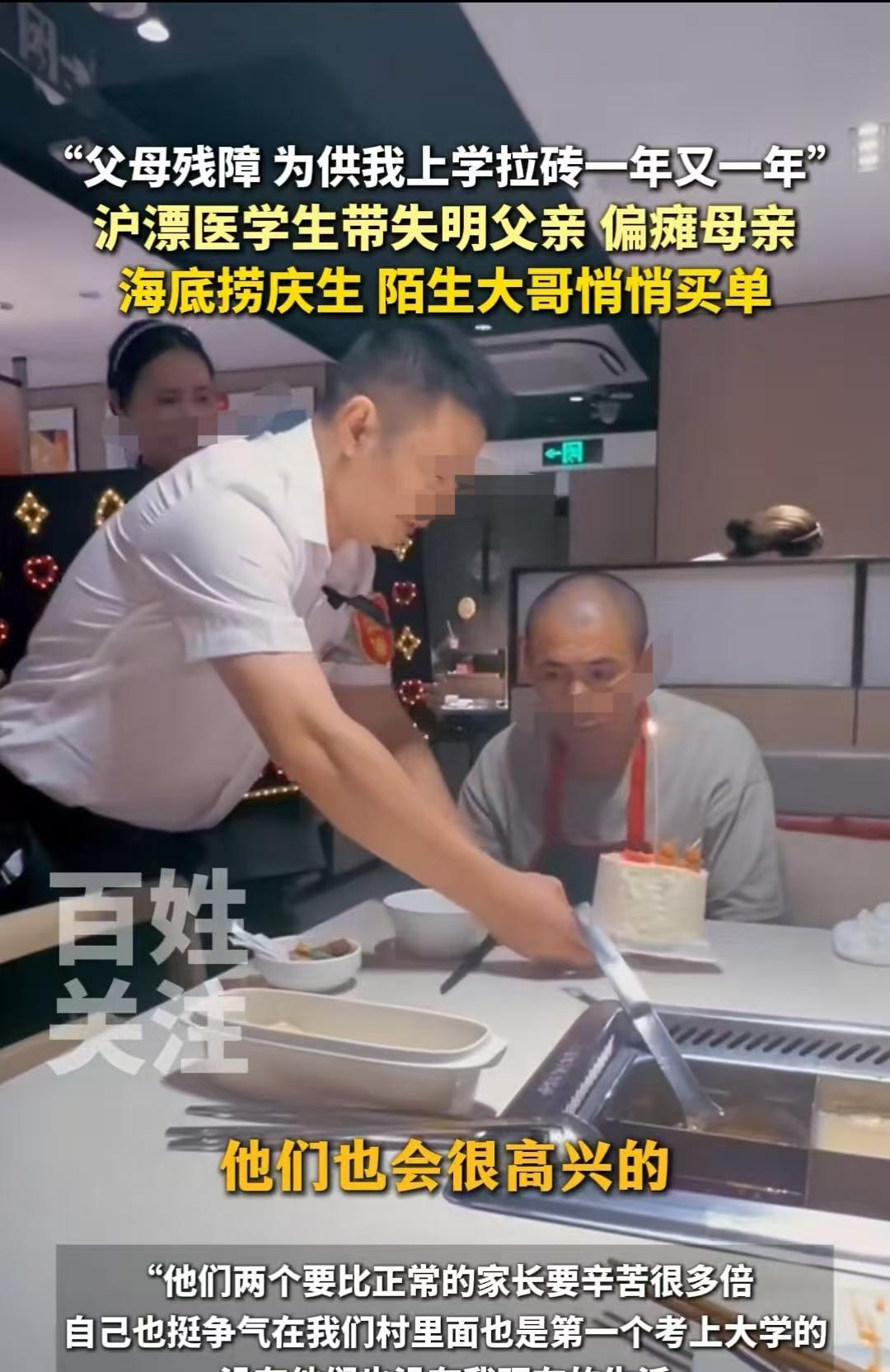上海,杨先生带着失明的父亲、偏瘫的母亲去捞得乐,为55岁的父亲过生日。这是父亲第一次过生日,杨先生激动地跪在地上,感谢父母的养育之恩。他提到,父母为了供自己读大学,每天去砖厂拉砖,母亲身高只有1米4,却在砖厂没日没夜地干活。食客们听着杨先生讲述这些经历,纷纷为其鼓掌,更有好心的大哥悄悄为他们买单。 杨先生已经毕业并找到了工作。他之前学习医学相关专业,后来转行做医学科普,每个月收入也有7000多元。 在上海,这个工资虽然不算多,但杨先生刚入社会,他表示以后会更加努力,工资也会随着经验和工龄的增长而提高。 杨先生看到父亲已经55岁,此前从未过过生日,便和父母商量,带他们一起去捞得乐,给父亲正儿八经地过一次生日。 父亲虽然嘴上说“还是不去了,节约一点”,但脸上却堆满了笑容。 父亲在前些年眼睛还看得见时,会四处打工,和妻子一起奋斗,供儿子上大学。 后来因视网膜病变几乎失明,只剩一点光感,村里有人便叫他“杨瞎子”。 他表面上看似不介意,内心却很难受,只希望能得到尊重,哪怕只是被人简单地叫一声名字。 没过多久,母亲又突发偏瘫,经过三次大手术才抢救回来,这个家庭的处境变得更加困难。 在村里,他们的处境愈发艰难,唯一能让他们抬头挺胸的事,就是儿子考上了大学——杨先生是村里的第一个大学生。 他们下定决心,无论如何都要供儿子读完大学,这是他们全部的希望。 杨先生也没有辜负父母的期望,靠着勤工俭学和父母的支持,顺利毕业,随后在上海找到了工作。 他稍微安顿下来,就把父母接到了身边,不想让父母再回去过苦日子。 杨先生认为,虽然现在自己工资不高,但孝敬父母要趁早,否则等真正富裕了再想尽孝,很可能已为时已晚。 当天,杨先生带父母来到捞得乐,还提前为父亲准备了一个小蛋糕。 看到父亲脸上洋溢着久违的笑容,杨先生情不自禁地跪在地上磕头,感恩父母的养育之恩。 周边的食客起初投来诧异的眼光,听完杨先生讲述自己的家庭经历——父亲55岁才过第一次生日,是父亲用肩膀托起了自己的人生。 他又介绍身旁的母亲,虽然现在偏瘫,但以前为了分担家庭压力,凭着1米4的身高在砖厂每天来回拉砖,只为让自己在学校手头能宽裕一点——食客们深受触动,纷纷鼓掌,现场气氛格外温暖。 之后,更有一位好心大哥悄悄为他们结了账。 杨先生对那位大哥表达了感谢,还提到父亲回到家后乐得像个孩子,一整晚都没睡着。 父亲对杨先生说:“55岁了,终于过了一个生日,比那些瞧不起我的村民过得好多了。” 杨先生则对父亲说:“以后这个家就由我来撑,您安心养好身体,相信我们的家会越来越好。” 网友们看到这段故事后纷纷热泪盈眶,大家表示:父母身残志坚,为了孩子不畏艰难;孩子也懂得感恩父母,这是双向奔赴的爱。祝愿这个家庭越来越好,越来越幸福。 杨先生懂得父母的难,父母也懂得孩子的爱,这个故事体现了家庭中相互理解与关爱的美好,也与法律规定的父母子女间的权利义务相契合。 根据《民法典》第二十六条规定,父母对未成年子女负有抚养、教育和保护的义务。 杨先生的父母在他上学期间,无论生活多么艰难,都全力供他读书,父亲四处打工,母亲在砖厂没日没夜地干活,这是他们履行抚养义务的体现。 他们为杨先生提供了生活保障和受教育的机会,助力他成长成才,用行动践行了法律赋予父母的责任。 《民法典》第二十六条也规定了成年子女对父母负有赡养、扶助和保护的义务。 杨先生毕业后,虽然工资不算高,但他将父母接到身边照顾,解决父母的生活照料问题,是履行赡养义务的核心体现; 他带父亲过人生中第一个生日、关注父亲对“被尊重”的需求,用陪伴与仪式感给予父母精神慰藉,这正符合“扶助和保护”义务中对老年人精神需求的关注,也让法律条文里的义务变得有温度。 对于杨先生和他父母的这件事,大家如何看待呢?文中人物均为化名,素材来源于百姓关注9月15日报道。