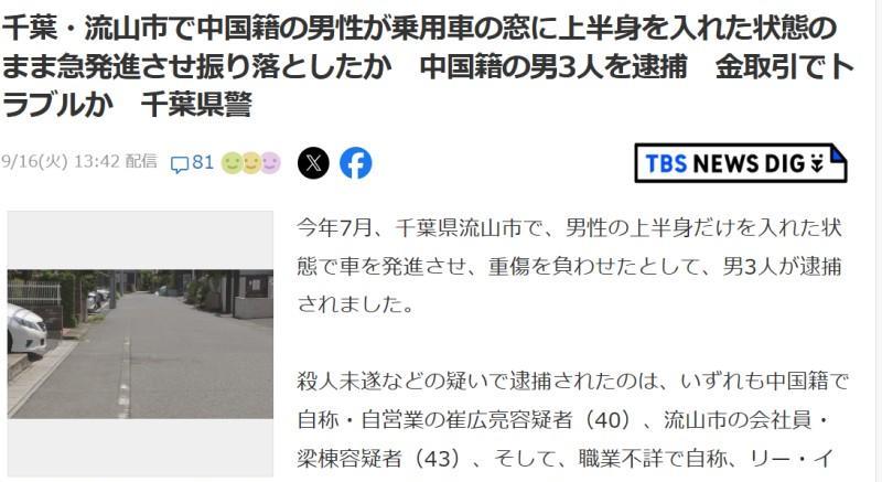 千叶县3名男子涉金条交易纠纷被捕 9月16日《TBS新闻》报道三名中国籍男子被捕的消息。 案件发生在今年7月,汽车内的三名男子在受害人只有上半身在车内的情况下,启动汽车行驶造成该男子重伤。 三人因涉嫌谋杀未遂等罪名被捕。 他们涉嫌今年7月22日夜,在流山市的市内道路上,试图杀害另一名中国男子(40岁),受害人上半身在车窗内被拖行了约120米后,甩出车外后导致颌骨骨折等重伤。 据警方称,受害男子试图将金条卖给崔某等三人时,金条被抢,他将上半身伸进车内,试图拿回金条。 这块金条来自东京的一家金店。 警方还在调查案件的细节。