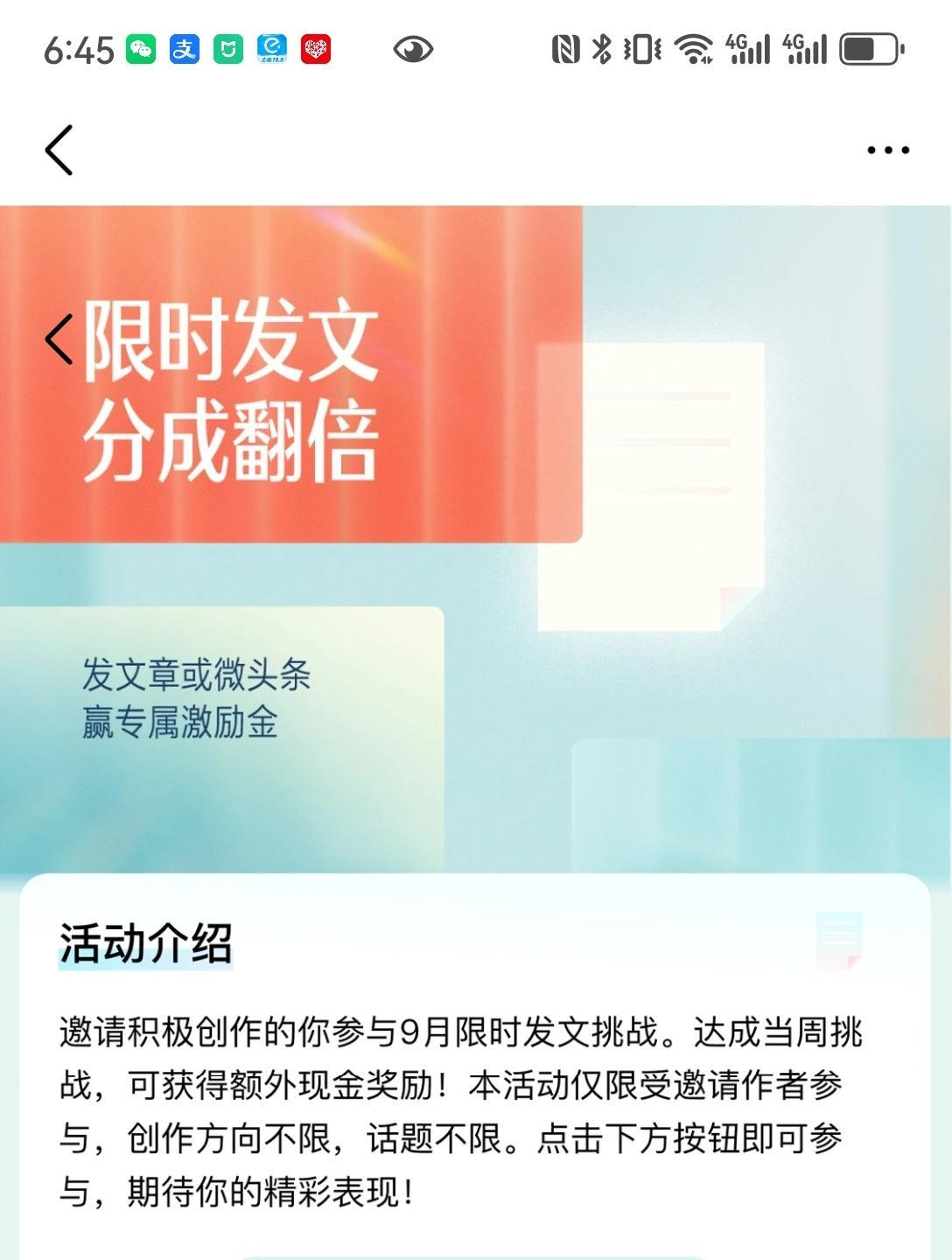 “限时发文分成翻倍”活动还有最后一周。 活动介绍说:邀请积极创作的你参与9月限时
