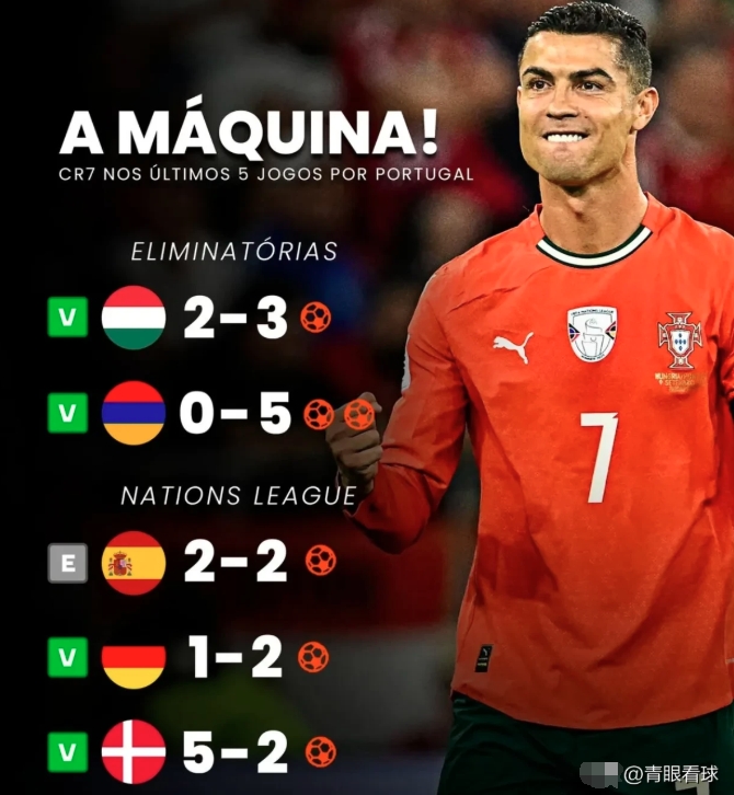 C罗连续5场国家队比赛进球,将国家队进球纪录刷新到141球,未来只有哈兰德有望达到C罗的高度。 欧国联1/4决赛、半决赛和决赛,C罗先后攻破丹麦、德国和西班牙的球门,率领葡萄牙夺得欧国联冠军,C罗成为首位连续三场欧国联淘汰赛破门的球员。 世界杯欧洲区预选赛,C罗接连攻破亚美尼亚和匈牙利的球门,率领葡萄牙取得两连胜。 欧洲无弱旅,C罗连续5场比赛攻破欧洲豪门的城池,整个世界足坛无出其右。