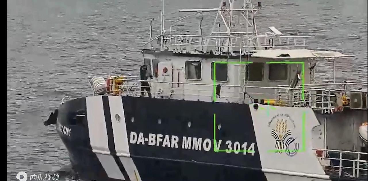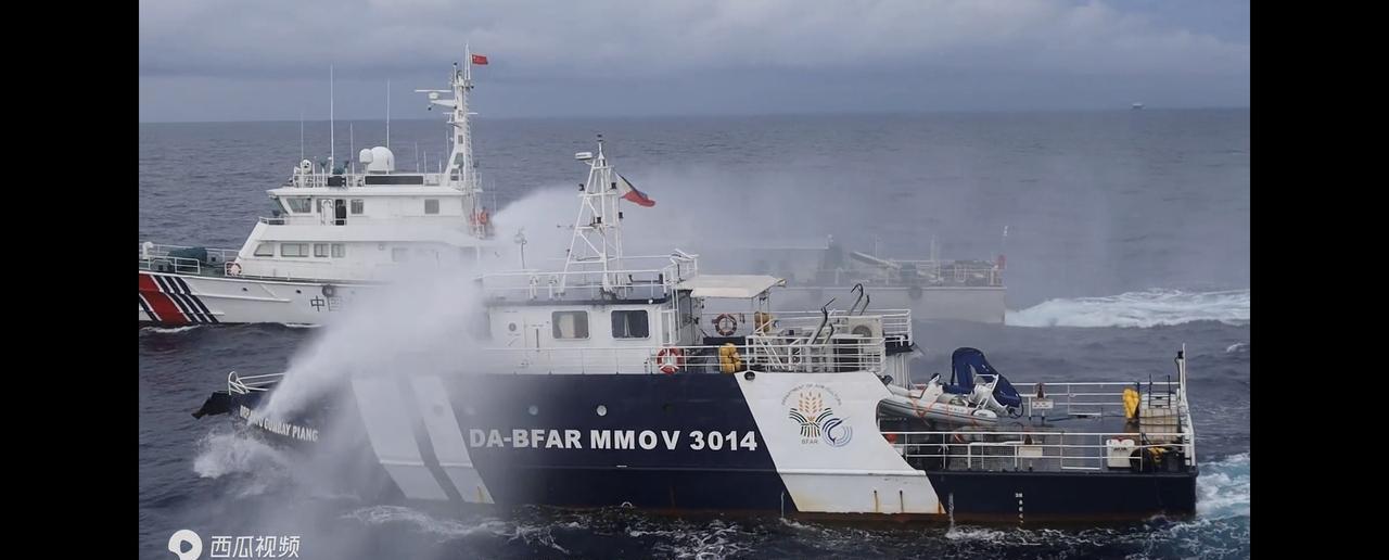 难怪今天菲律宾那边是鸦雀无声啊,因为实在是太精彩了! 大家看图吧,真是妙不可言啊,菲律宾派了几艘破船也想冲撞我们大船,尤其这个3014号,大家记住这个舷号。 已经直接碰上我们的船了,那就不要怪我们不客气,我们只能请他们喝海水了! 哪知道,还没几分钟就喝饱了撑了,实在吃不消了,然后从船舱里钻出一个黑不溜秋的光着膀子的汉子,举着他的不知道是内裤还是背心,反正是白色的,他是不停地挥舞,最后还双手把这个白内内举过了头顶,让我们不要再给他们喝海水了。 边上还有一个穿着救生衣的汉子,也在那儿告饶着。 难怪菲律宾今天是一声不吭啊,因为这个人真丢不起啊,但是已经迟了,相信这个视频已经传遍世界咯!