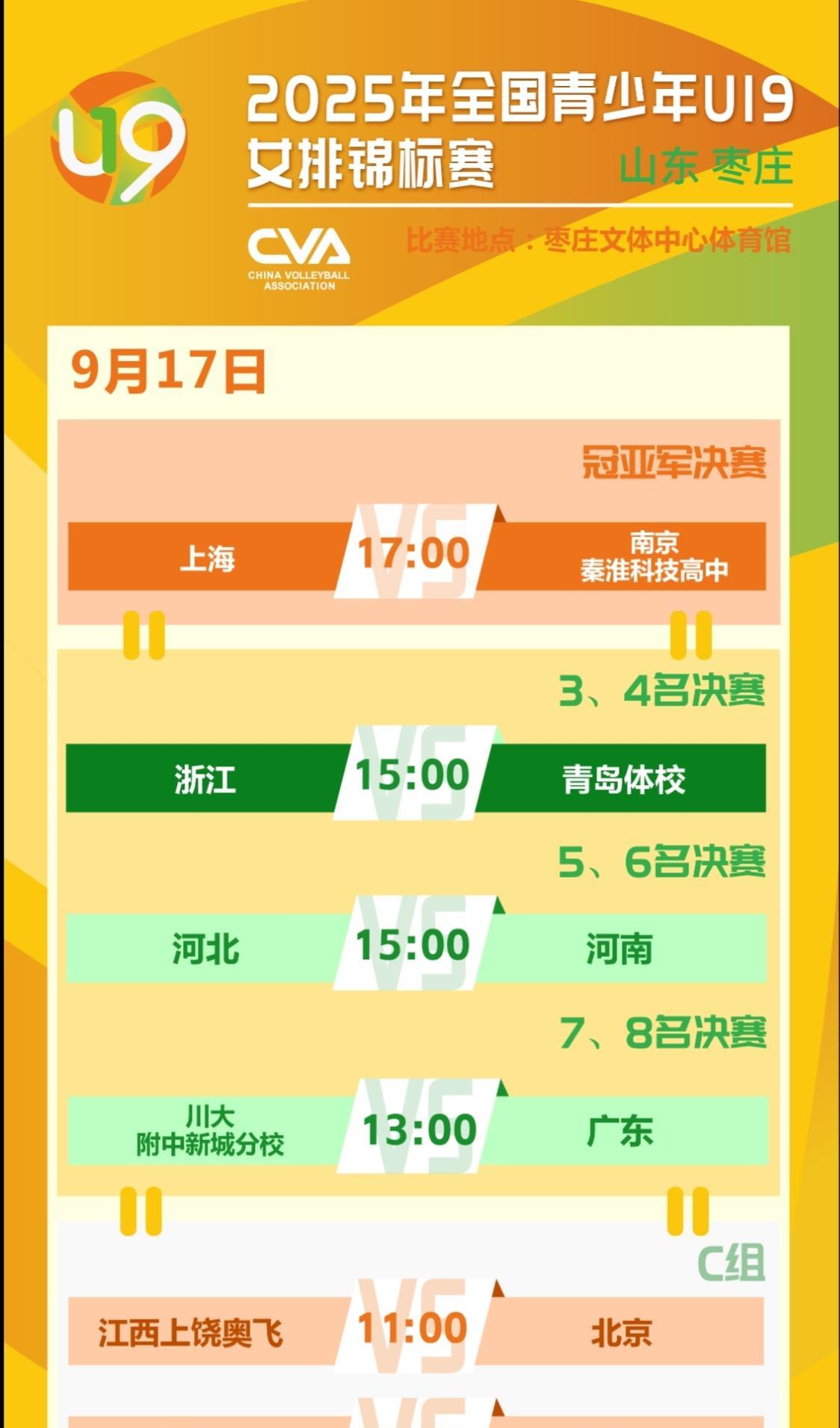 [U19女排全锦赛]冠亚军决赛、铜牌战赛程: 铜牌战 —————————————— 9月17日15:00 浙江 —— 青岛 —————————————— 冠亚军决赛 —————————————— 9月17日17:00 上海 —— 南京 ——————————————