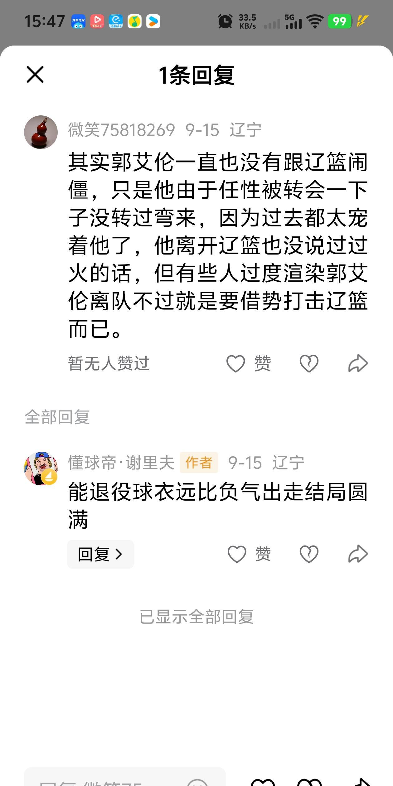 郭艾伦能否重来辽宁! [图1]辽宁自媒体对此表示:郭艾伦近期返回到辽宁队训练馆进行训练,表示有两个好的信号。 说郭艾伦作为辽宁人,休赛期又回到辽宁参与各种活动和赛事,证明郭艾伦与辽宁队的关系并没有完全破裂,随着年龄的增长和广州只剩一年合同的情况下,选择落叶归根是明智之举,还说郭艾伦需要写一份检讨书,诚恳认识到自己的错误。 [图2]有些辽宁球迷说,怎么样都是自家孩子,偶尔无知.做些过火的事情,但只要是认识到错误,辽宁球迷还是会接纳郭艾伦。 [图3]辽宁球迷说,辽宁队只要有杨鸣在,郭艾伦不可能回归到辽宁队。 [图4]辽宁球迷说,郭艾伦并没有和辽宁队闹翻,因为辽宁队过去太宠郭艾伦而已,他也没说对辽宁队说过过火的话。 辽宁球迷真是脑洞大开,你们都是辽宁队经理高层还是工作人员,怎么如此清楚事情的来龙去脉,还是在这里自其圆说罢了。