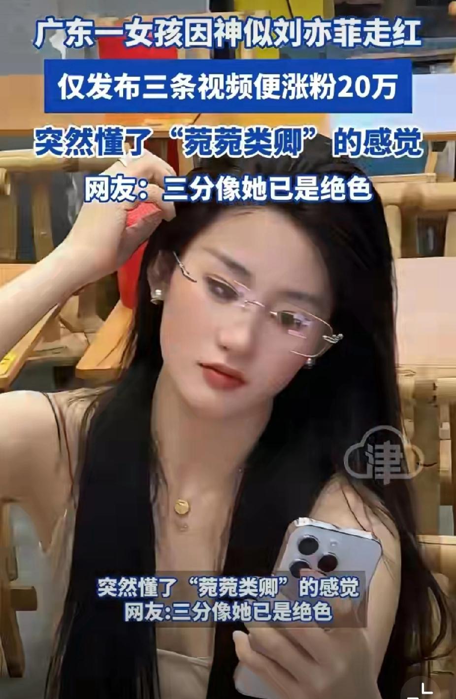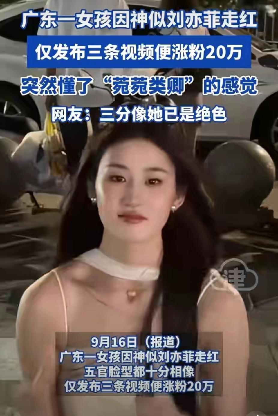 广东“小刘亦菲”凭三则视频吸粉20万,“菀菀类卿”引热议 9月16日消息,广东一名女孩因长相神似刘亦菲引发关注。她的五官、脸型与刘亦菲高度契合,仅发布三条短视频,便迅速收获20万粉丝。网友见状纷纷感慨,“这下彻底懂了‘菀菀类卿’的含义”,更直言“哪怕只有三分像她,已是难得的绝色” 。#菀菀类卿# #苏菀菀# #歌曲菀菀类卿#