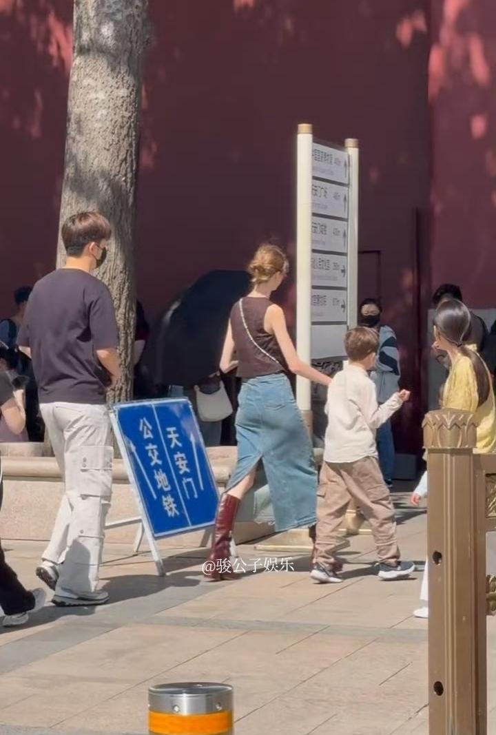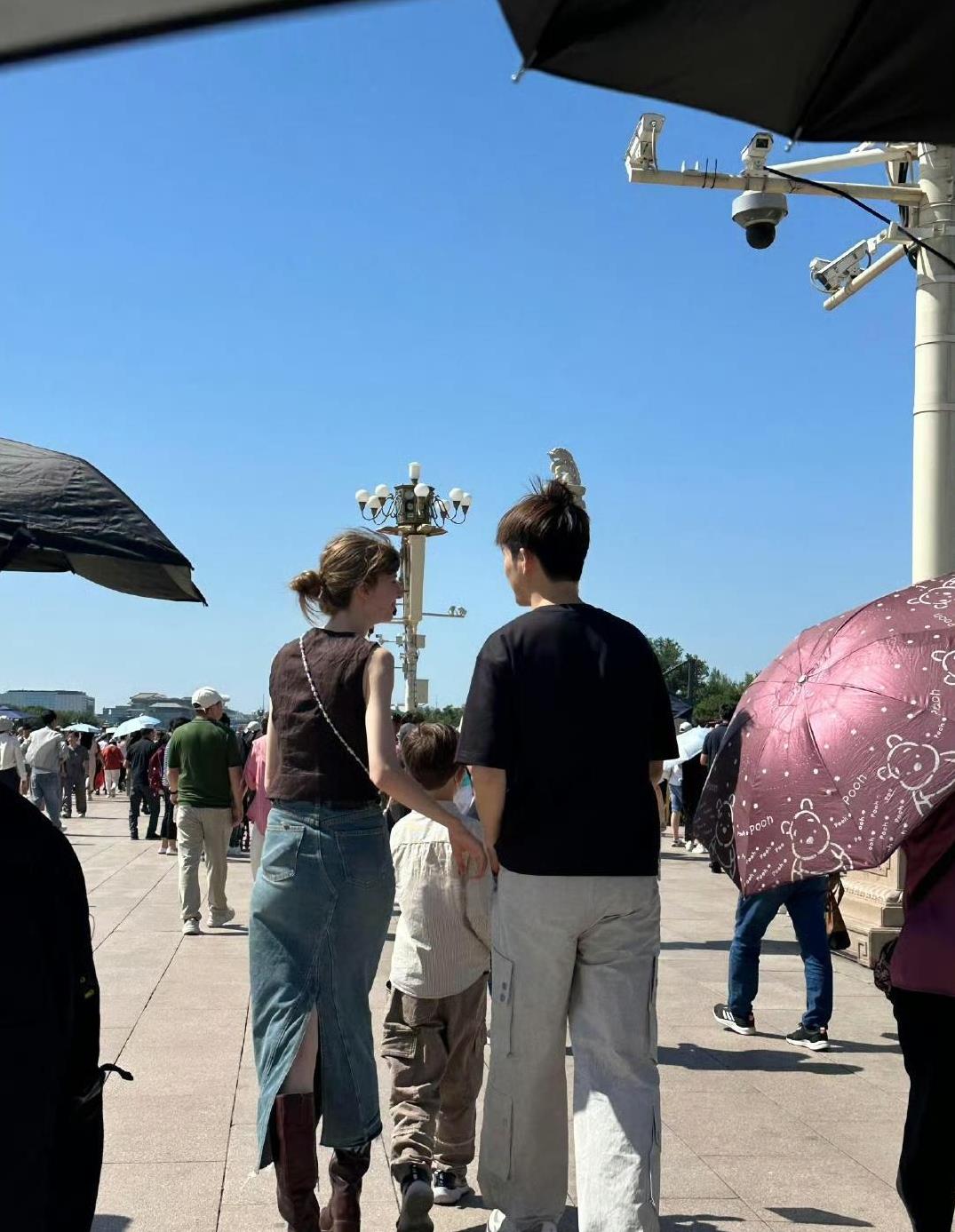 董力阿诺一家三口游北京天安门,阿诺气质出众,董力高大帅气,混血儿子很可爱,一家人