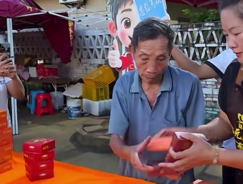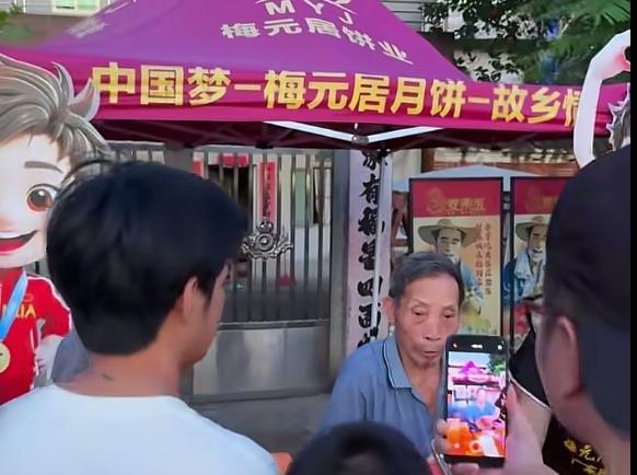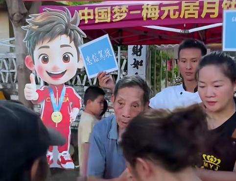 全爸为庆祝女儿暨大入学,又赶上中秋在即,在家门口支桌子给村民和游客分发月饼,背景还有全红婵的卡通版及在暨大举的牌子。 全红婵的爷爷,也加入了分发月饼的行列。全红婵的爷爷虽然看起来苍老又瘦了,但是精神头十足。 迈合村热闹非凡,每人两个月饼,大家拿到免费的月饼都笑得超开心。 甚至有游客从1000公里外赶来,就为了赶上吃喜饼的好事,月饼是当天新鲜出炉的。 全红婵成名后给迈合村带来了流量,全爸一家人对大家也很大方,这样的氛围太暖心啦!