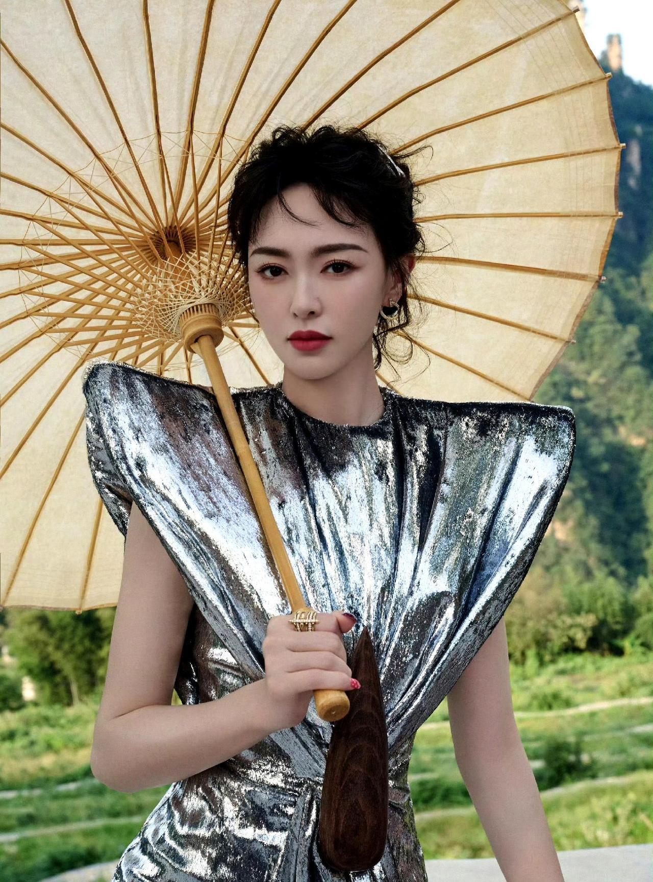 #分享城市新鲜事# 唐嫣今日营业造型太绝啦!!! 只见照片中的糖糖,身穿银色未来感礼服,搭配古朴油纸伞,身后是层峦叠嶂的山水盛景,赛博朋克、原始元素与中国山水风巧妙混搭,在自然间碰撞出别样时尚火花,这样的她美到让人失语。