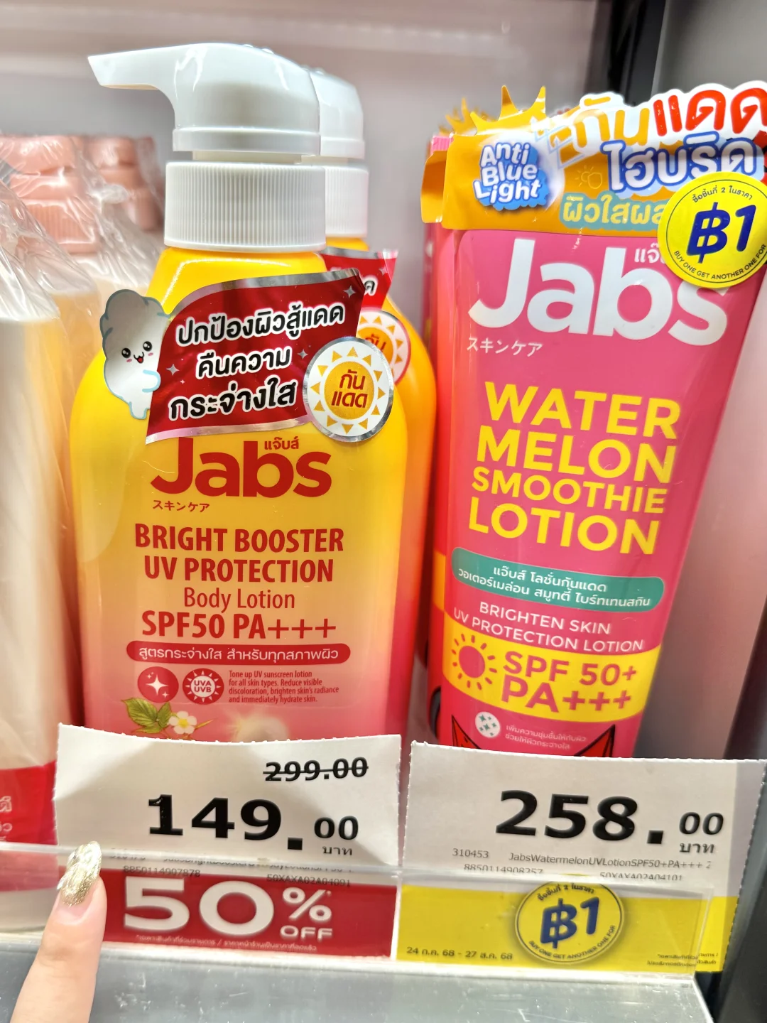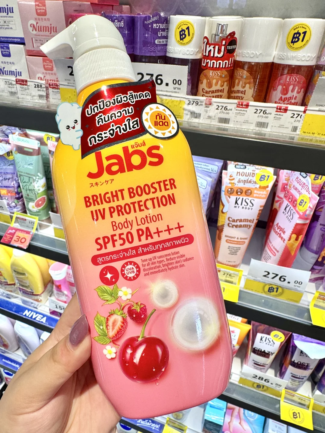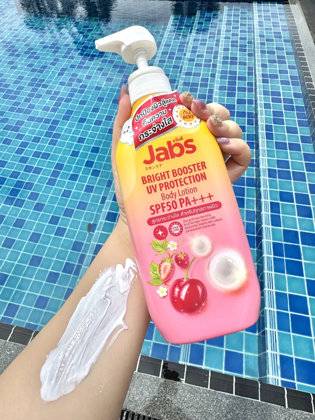就是🇹🇭Jabs这个防晒身体乳‼️我真的震惊了😱用了一次就爱上了 防晒指数SPF50PA+++‼️不仅保湿滋养肌肤还可以提亮肤色1-2个色阶‼️含有丰富的天然水果萃取物、维生素C、E、B3及熊果素 能够代谢老废角质让肌肤更加焕白透亮‼️而且不假白、不泛灰‼️还能防护 UVA与UVB紫外线伤害🥰每天都可以用哦‼️ 我在海岛🏝️暴晒了一周都没有晒黑‼️超大一瓶性价比真的很高啦‼️来泰国旅游的姐妹在屈臣氏或淘宝就可以找到 千万别错过哦‼️