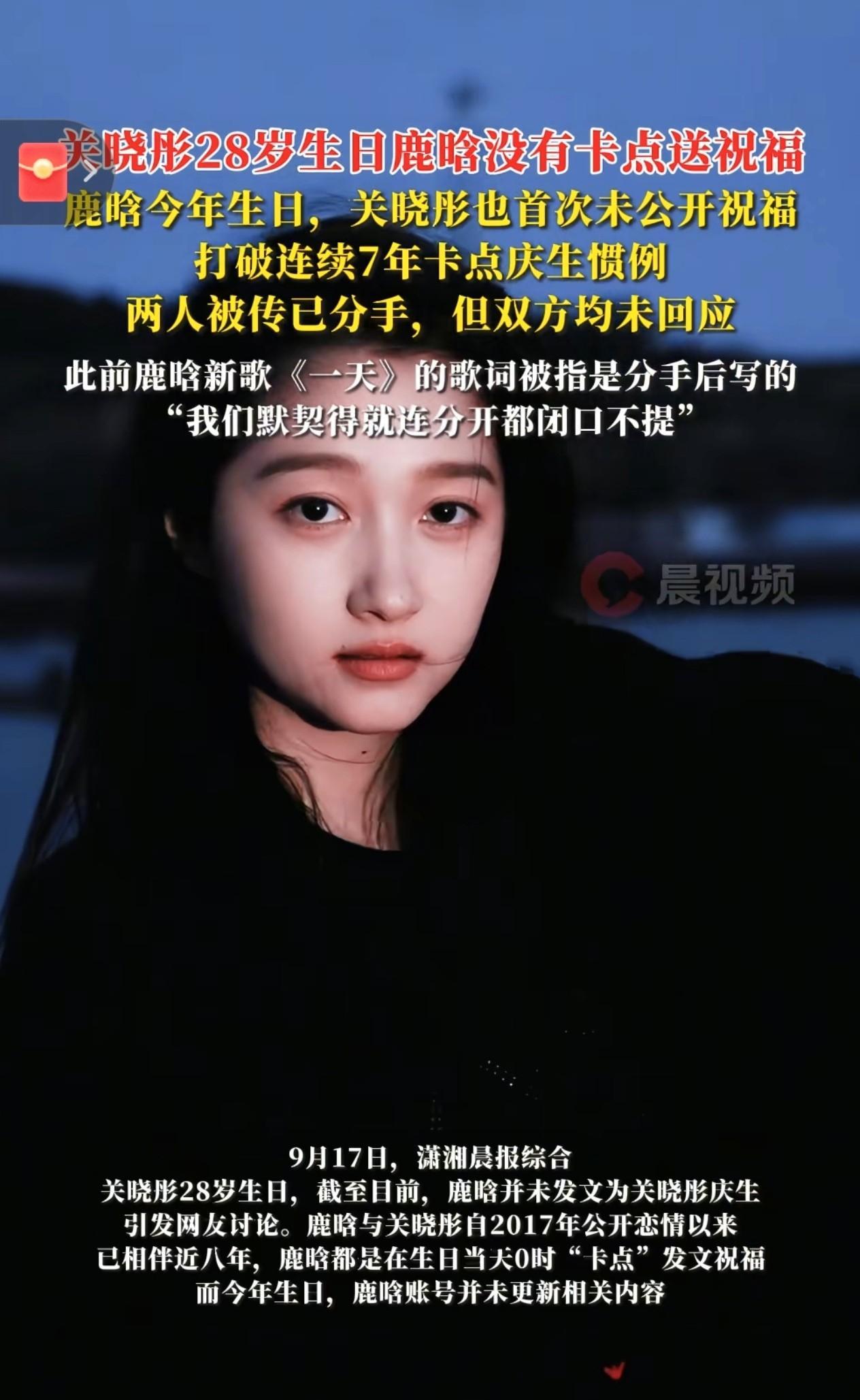 9月17日,关晓彤迎来28岁生日,截至目前,鹿晗并未发文送上祝福,这让网友们炸开了锅。 自2017年公开恋情,近八年来,鹿晗每年都会在关晓彤生日当天卡点送祝福,可今年却没了动静,两人的感情状况再度引发热议。今年4月鹿晗生日时,关晓彤也未公开祝福,打破了连续7年卡点庆生的惯例。不仅如此,今年七夕,两人也没有任何互动,种种迹象让分手传闻甚嚣尘上。 此前,鹿晗发布的新歌《一天》中,“我们默契得就连分开都闭口不提”的歌词,也被不少网友猜测是在暗示分手。尽管双方均未对此作出回应,但粉丝和网友们都在密切关注着,期待他们能早日给出一个明确的答案 。#明星# #关晓彤# #娱乐圈# #娱乐圈每日热议#