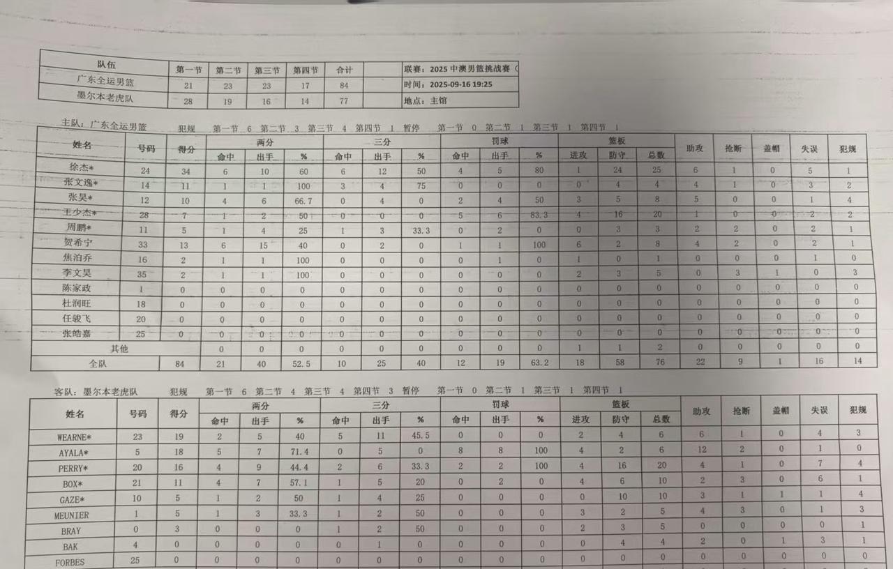 广东全运会男篮 84-77 战胜墨尔本老虎队。本场比赛,徐杰超神发挥,独得 34 分,最终带队取胜。 徐杰自从国家队归来后似乎憋着一口气,总是想要释放,最近在广东男篮的一系列热身赛中都有不错表现。 这一次更离谱的是他一个人拿了 25 个篮板,其中 24 个防守篮板,这让很多人都有所怀疑,因为球队内线王少杰也才拿到 20 个篮板,就算徐杰有“徐中锋”的名号,拿到这样的篮板数据也是不可能的。