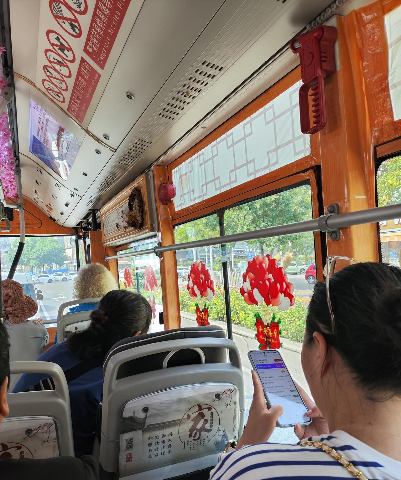 看看我们的小公交车,真是比我们家里布置的还喜庆! 上周六我坐公交车去超市,坐上一