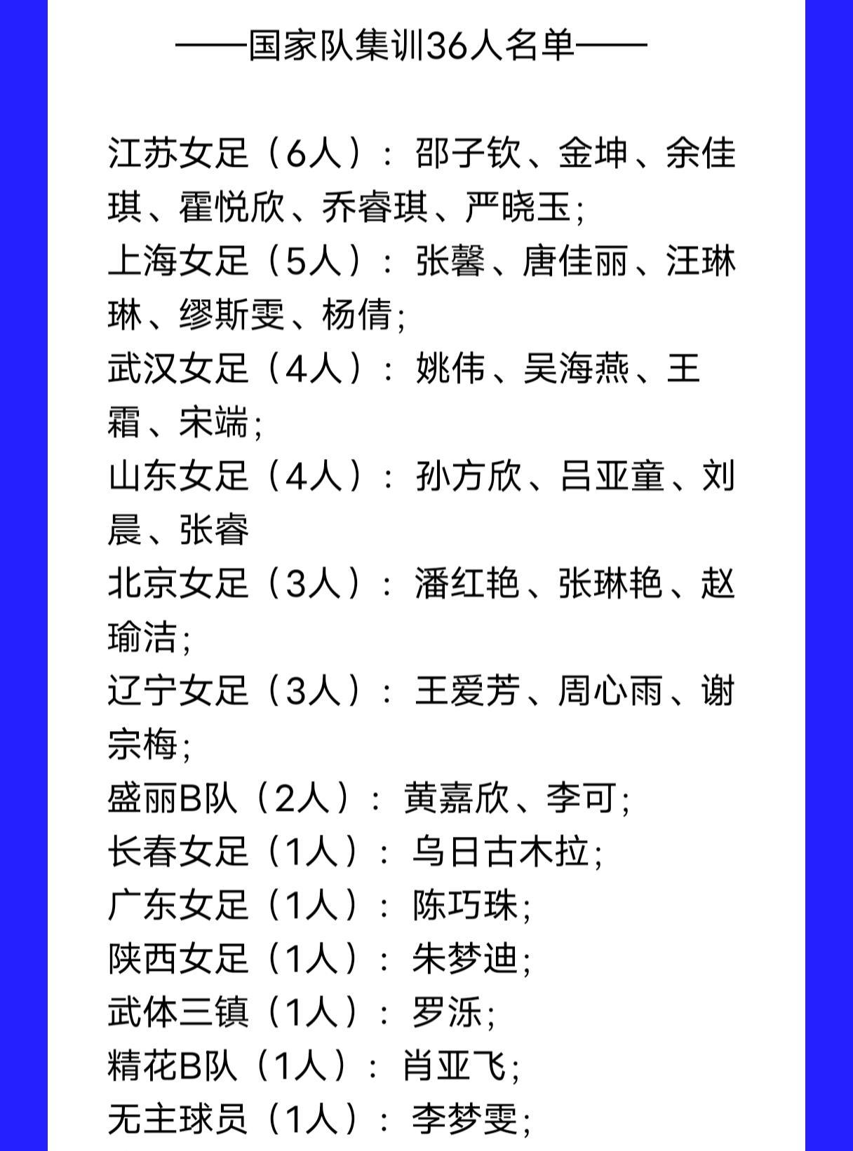 中国女足第六期集训即将折腾完毕,根据中国足协8月25号通知,9月19号是集训结束的日子。 9月19号结束集训,9月20号女超最关键的第21轮生死战,宋凯、孙雯又联袂上演了一出全世界绝无仅有的竞技体育大戏,他们赤裸裸的将中国女足精英们压榨得体无完肤,他们考虑的是自己的政绩、而绝非是俱乐部的利益与运动员的生死。 就像6月下旬到7月中旬的集训一样,江苏女足成了联赛最大的牺牲品,东亚杯、U20小组赛期间,江苏女足被抽调球员狂飙至11人,导致少帅陈婉婷冲天一怒在记者会上喊出“中国足协的管理水平是阻碍中国足球发展的最大短板”这一绝对真理。 本期临时撕裂联赛的集训、以及U23国家队集训同步进行,江苏女足又被疯狂征召9人,其实中国足协的意图早已经非常明确——全力以赴、歇斯底里的阻击江苏女足夺取2025赛季女超冠军。 现在的问题是,明天晚上(18号)会结束这场目的极其阴暗、球员鱼目混珠的集训吗?还是19号上午还要训练、然后19号下午再各回各家? 20号武汉女足客场挑战辽宁女足的比赛大概率凶多吉少,一是四大核心参与了国家队每天的高温训练,二是19号集训一结束还得数千里路从苏州奔赴吉林,这番无缝对接的操作下来,精疲力尽的吴海燕、姚伟们拿什么去对抗在家以逸待劳的叶彤、侯舒楣们? 你能相信吗?辽宁女足是冠军,她们必须是冠军! ——国家队集训36人名单—— 江苏女足(6人):邵子钦、金坤、余佳琪、霍悦欣、乔睿琪、严晓玉; 上海女足(5人):张馨、唐佳丽、汪琳琳、缪斯雯、杨倩; 武汉女足(4人):姚伟、吴海燕、王霜、宋端; 山东女足(4人):孙方欣、吕亚童、刘晨、张睿 北京女足(3人):潘红艳、张琳艳、赵瑜洁; 辽宁女足(3人):王爱芳、周心雨、谢宗梅; 盛丽B队(2人):黄嘉欣、李可; 长春女足(1人):乌日古木拉; 广东女足(1人):陈巧珠; 陕西女足(1人):朱梦迪; 武体三镇(1人):罗泺; 精花B队(1人):肖亚飞; 无主球员(1人):李梦雯; 临时补招(1人):王芙蓉; 特殊奖励(2人):司雨、郭楠。