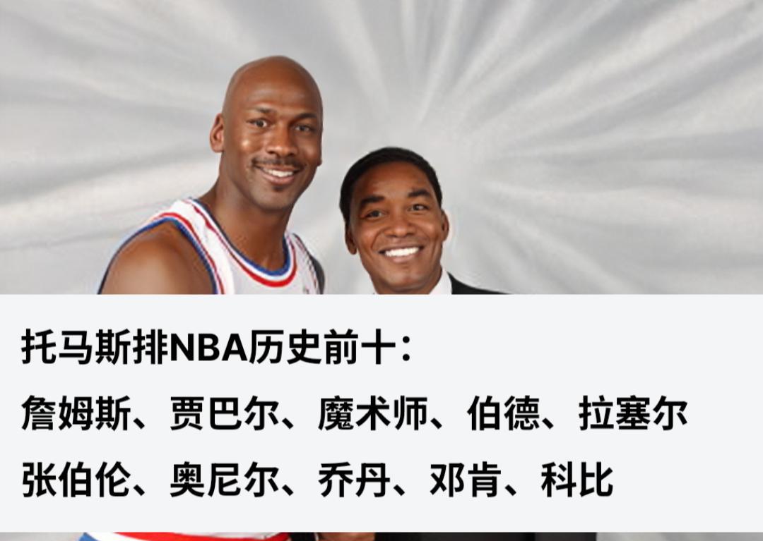 相信我 他俩肯定已经和解了 他的这份排名 绝对是没有任何私人恩怨在里面的 微笑刺客托马斯排NBA历史前十 詹姆斯第一 托马斯盛赞詹姆斯的全能性 NBA历史上从未出现过 这样一位在每个统计类别上 都有所涉及 并且在一些类别中 处于领先地位的球员 乔丹仅第八 科比第十