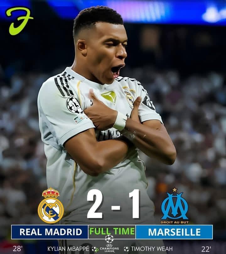 欧冠赛事第一轮: 姆巴佩点球破门梅开二度,十人皇马2比1逆转马赛,如愿取得欧冠开