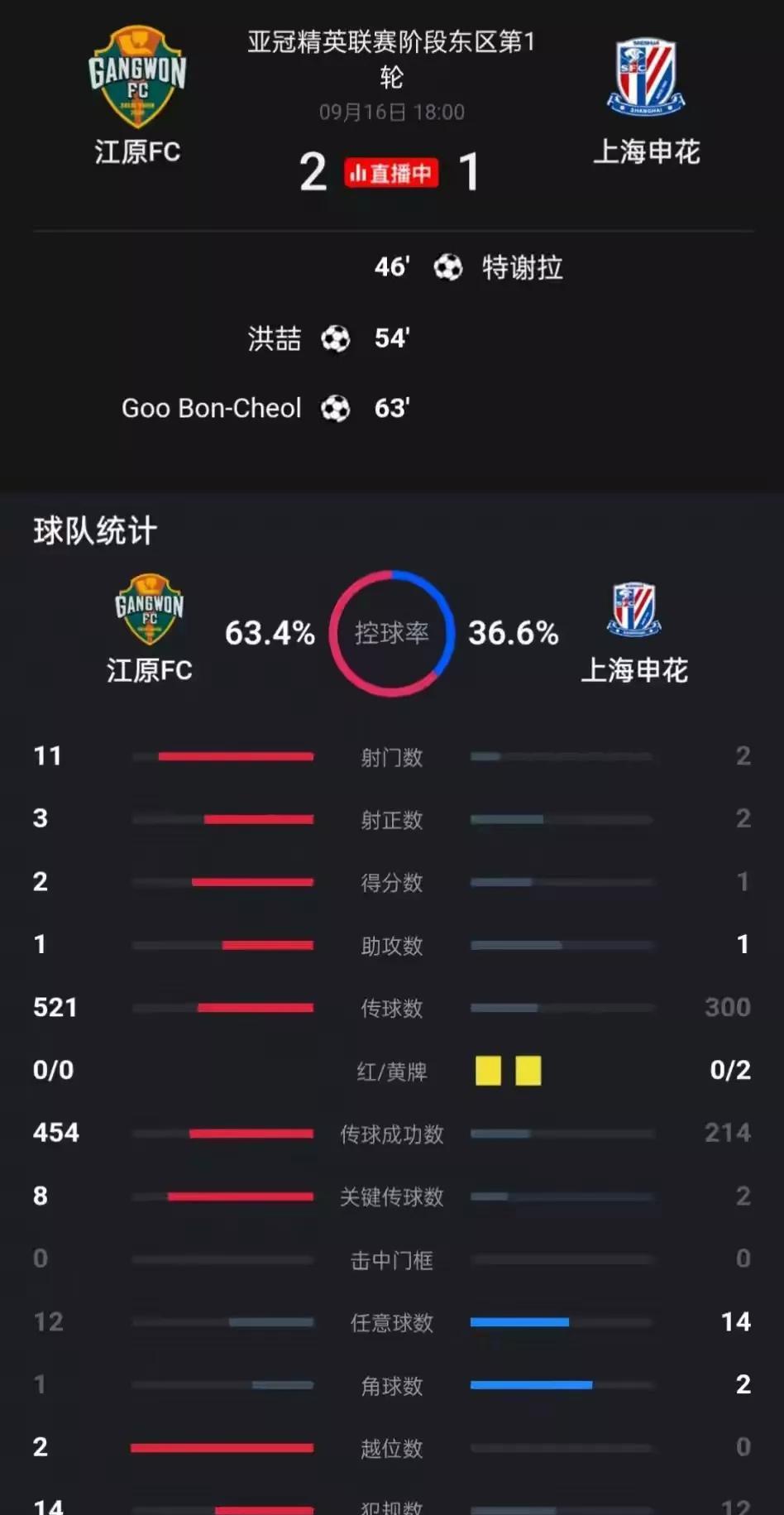 失去中场控制 很难赢球 低的可怜的控球率 上海申花不输才怪呢 #分享城市新鲜事# 上海申花对阵韩国K联赛江原fc,虽然上半场凭借特谢拉的一己之力帮助上海申花1-0领先对手,这也是对手经验不足送给了上海申花一次机会,这机会也就是特谢拉,要是换成其他人,就是射N遍,也不一定能打进去。 下半场一球落后的江原fc绝不可能在自己的主场吞下失败的苦果。 他们通过换人,利用拼抢和控球能力,压制住了上海申花的进攻,牢牢抓住了主动权,比赛节奏被江原所控制。 从控球率就能看出来,上海申花的控球率仅仅36.6%,对手高达63.4%,如此悬殊的控球率,也就难怪下半场江原fc七分钟内连入两球反超比分。 从11-3的射门数也能看出江原的进攻更盛,完全压制住了上海申花的进攻。 特别是上海申花第70分钟就换下中场大将特谢拉和后防高天意,控球更不行。没有了中场的梳理,上海申花赖以反击的机会都少的可怜。 不过,在路易斯、米内罗等主力球员缺席比赛的情况下,能够客场一球小负,上海申花应该能够接受。 #亚冠# #亚冠精英赛# #上海申花# #中超领头羊申花# #申花队# #上海申花超话# #申花亚冠# #申花若能赢球# #申花米内罗# #上海身边事# #青岛身边事# #成都身边事#