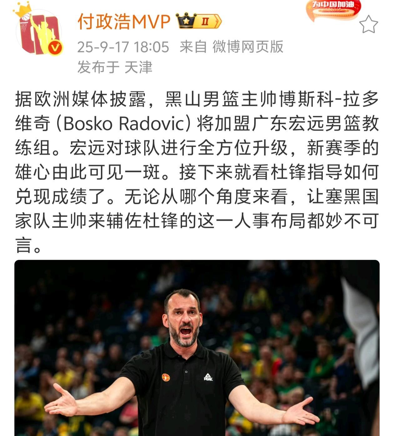 大手笔,国家级教练驰援杜锋! 广东宏远再次引援助力杜锋,弥补教练组伊戈尔离队的空缺位置。 据篮球知名博主透露:黑山国家队名帅博斯科.拉多维奇将加盟广东队,辅助杜锋出任广东队助教一职,他拥有丰富的国际大赛执教经验,曾带队征战过欧洲杯、世界杯等重要赛事。 辽宁媒体人对此表示:广东队休赛期一系列的补强,这次为杜锋增添拥有如此丰富执教经历的助教,广东队所有的操作针对性补强,展现出对下赛季总冠军的争夺与信心。 朱芳雨近日接受采访时表示,投资人投入那么多,广东下赛季的目标就是冲击总冠军,以现在广东队的阵容有足够底气,对此广东球迷表示支持。