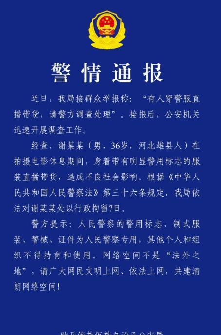 【嘎子哥穿警服直播被行拘7天】 嘎子哥早前在直播带货时穿警服,这件事早前在网络上各种发酵,近期相关部门对此事开展调查工作,17日晚,相关部门发布公告,嘎子谢孟伟在拍摄电影休息期间,身着警服直播带货,由此造成了极其严重的不良影响,相关部门对其处以行政拘留7日的处罚,嘎子哥这也是没谁了。 嘎子哥身上,真的是不缺少故事,从最初和潘长江引发的争议,再到早前和反诈老陈引发的纠纷,以及到现在的警服事件,这后面还能在娱乐圈继续混吗?#嘎子#