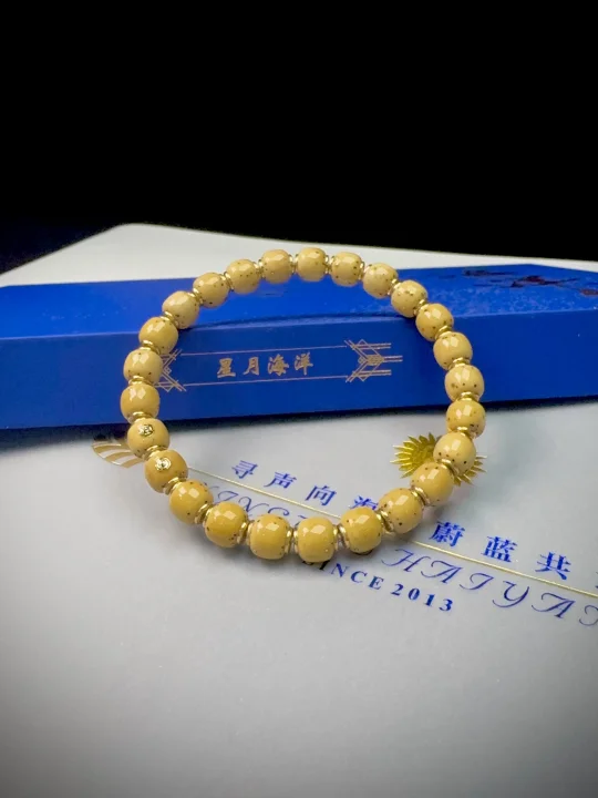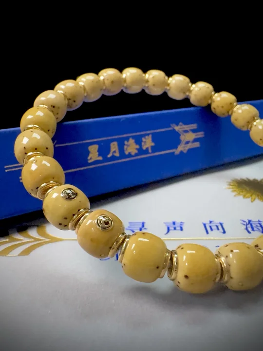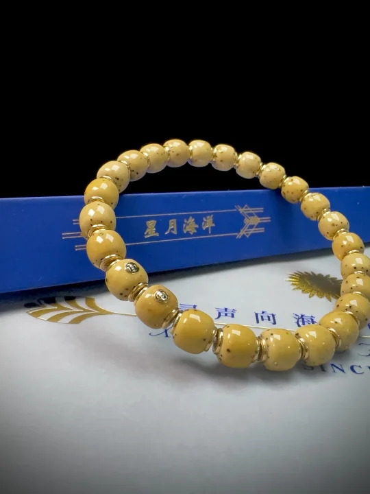 ✨ 以「奢」为心,沉淀时光的优雅馈赠 🌟 何为「奢」? 不是炫耀,是匠心与自然的艺术结合! 这条定制的金墩是咱家出的第五款产品,特意选撷自然生长中最为珍贵的籽料,每一颗都是找星星品相,以「奢」为核,每颗珠子都搭配了接近一克的纯金(金墩0.77克左右)——每一颗菩提籽皆是自然亲手写下的诗意。它们的完美显得如此不真实、更接近于理想主义。 📿 设计亮点: ▫️「奢」中见雅|每一颗珠子轻嵌,可取可合,如星落月夜,有点睛之美 ▫️精选老料|盘玩走色统一,醇厚包浆,佩戴愈久,色泽愈润,悄然沉淀岁月气质 ▫️金墩形制|汉堡金件设计;配合老型珠体,饱满敦厚,手感温润贴合,绕腕间尽显尊贵奢华的格调 🌙 这条手串,献给懂得“自然产物圆满稀缺”的你。 不必追求无暇,不必执念极致——爱自己所爱. 正如生活,往往在那些不经意处,藏着你最从容的模样。 ✨ 佩戴它: 不仅是装饰,更是一场心性的修炼。 指尖捻过奢华的菩提,提醒我们:接纳生命的真实,与自我和解,方见天地开阔。 让星月为伴,金墩作序,在日常中修一颗淡然之心。