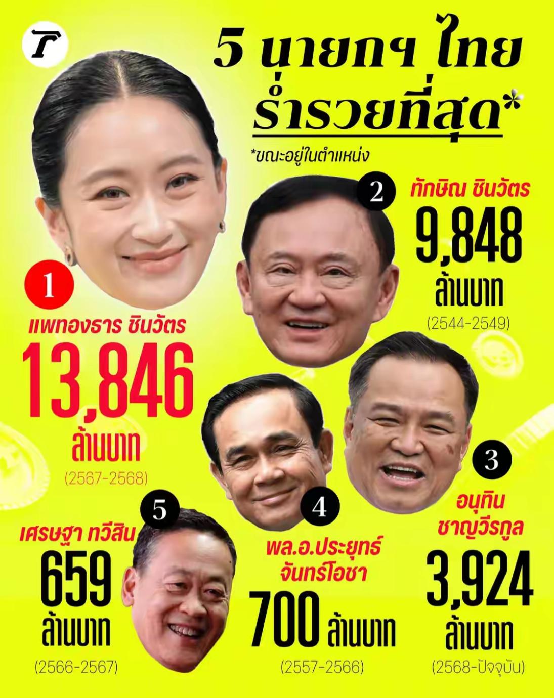 泰国总理资产榜刚更新! 他信之女以近30亿人民币登顶 这笔“政商财富账” 泰国人怎么算都觉得有看头 先看最扎眼的数据:泰国国家反腐败委员会披露 前总理佩通坦·钦那瓦个人资产达138.46亿泰铢(约29.29亿人民币) 直接甩开第二名——她父亲他信的120亿泰铢(约25.4亿人民币) 更把新任总理阿努廷的40亿泰铢、前总理巴育的7亿泰铢远远抛在身后 再看财富构成的门道:佩通坦的资产单里 100亿泰铢是投资,10亿泰铢是存款 还有12块土地、9处房产,甚至藏着75块名表、217个名牌手袋、205对耳环 这些奢侈品没单独标价 只笼统算进“个人物品” 对比阿努廷的40亿泰铢 11.84亿是存款,7.49亿砸在4辆宝马、1辆劳斯莱斯和3架私人飞机上,还有9.7亿泰铢的“权益及特许权” 华尔街日报直接点破了:“泰国政事人物的财富申报,藏着政商关系的密码 他信家族靠电信、房地产帝国打底 佩通坦的资产却多了‘投资+奢侈品’的新玩法 这或许是家族财富从‘实业’向‘多元持有’转型的信号。” 更值得细品的是普通人视角:曼谷一位小商户跟媒体吐槽:“我们卖一年泰式炒粉赚不到100万泰铢,总理们的一块表就能买半条街的店。”(泰国《民族报》) 现在的问题是 当政事人物的财富远超普通民众,他们的政策会不会不自觉地往“护资产”倾斜? 比如佩通坦的100亿泰铢投资,会不会影响她对资本市场的监管态度? 您觉得,政事人物的巨额财富,会影响其施政方向吗?