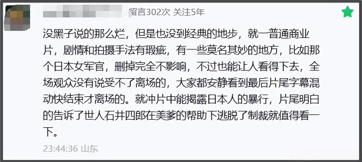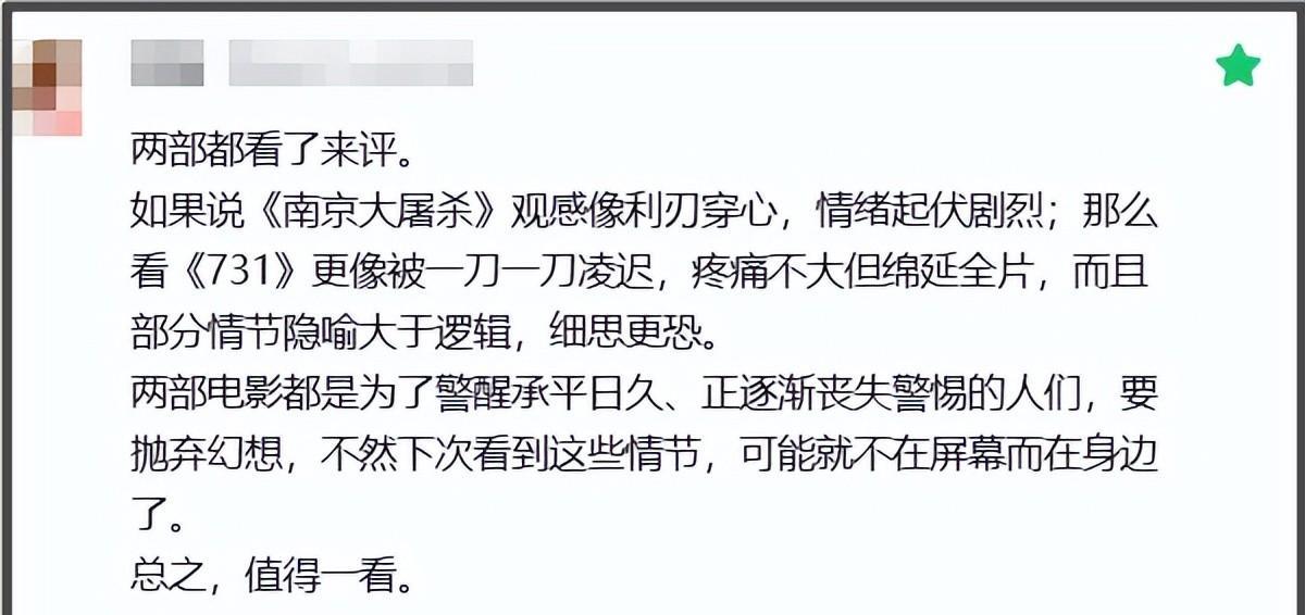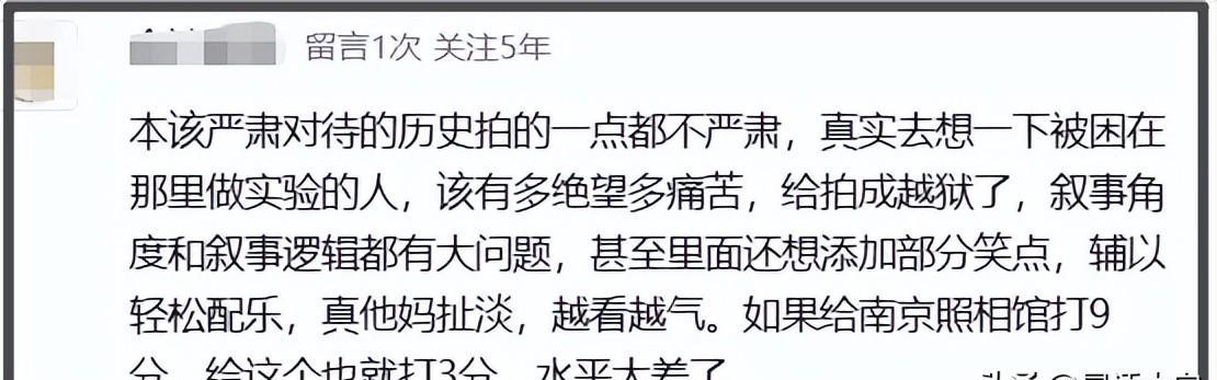 《南京照相馆》拍的水平整体是很不错的,所以在我方阵营网友里,基本没有什么争议,口碑很不错。 而从这部电影目前网络口碑来看,是远不如《南京照相馆》的,这个显然没办法从“敌对水军”角度来解释。 如果仅仅只是敌对水军因素,那么这部电影的口碑不至于比《南京照相馆》差这么多,那么这其中主要还是因为这部电影拍得不够好。 那么假设这部电影只是达到平均60分的门槛,那么必然在我方阵营里,有人会觉得还行,有人会觉得烂,就会进入到一个青菜萝卜各有所爱的局面。 一部勉强及格的电影,在这样一个特殊题材里,肯定是有人夸,有人骂。 从这点来说,我是反对片面的将一些批评声音,不分青红皂白就扣上“敌对水军”的帽子,这容易因为这部电影,分化爱国群众,不利团结。 比方说,我发的动态,是很少被外部推流,能在我动态里评论的,大都也是我的老观众了。 我看了昨晚的动态,目前阅读量是15万,跟我平常动态的流量是差不多的,并没有出现流量激增的情况,再加上我那条动态也没有什么关键字。 也就是,起码这个动态发出去这头几个小时,没有什么外部水军进来浑水摸鱼,这里的评论就会比较真实。 当然为了筛选,大家可以多看带有充电标签的用户评论,真实性会更强。 事实上,评论区虽然多数人认为这部电影比较一般,但也有认为从其他一些角度,觉得这部电影可圈可点的评论。 比如,有一个观众评论是认为,虽然这部电影剧情确实不是很流畅,割裂感很强,可以看出导演功力不是很足。但他认为从宣传角度来说,这部电影是值得肯定的。他认为这个电影的任务就是让更多的人知道这件事,所以电影里非常多的关于日本人虚伪掩盖的情节。 从舆论宣传,让更多人了解这件事情来说,确实能达到一些效果,起码因为这部电影,大众确实会在这个节点,对这件事情的关注度剧增,我也看到有人说,看完这部电影后,会更有想去了解这些事情其他更多的细节,从这个角度来说,这部电影也不能说是一无是处。 我晚上也在公众号发了这篇文章,也收集到读者一些反馈。 有觉得这部电影很差的。 也有觉得这部电影值得一看的。 也有相对中性的,觉得没那么烂,也谈不上经典,就一普通商业片。 但他认为:“就冲片中能揭露日本人的暴行,片尾明白的告诉了世人石井四郎在美爹的帮助下逃脱了制裁就值得看一下。” 以上这些读者评论,都是平时赞赏过我的老读者,评论应该真实可信。 没有调查就没有发言权,所以目前我只是通过调查读者感受,来谈谈个人看法。 本来晚上看到我自己评论区里,这片子一开始铺天盖地的差评,确实让我打消去看的想法。 不过看到这几个,虽然谈不上多数,但也确实存在的积极评论,让我想想还是过几天抽空去看看。 主要还是想试试雷,看看这片子实际情况到底怎么样,毕竟想要实际调查,还是得自己亲自去看。 所以,这片子在我自己看完之前,就先不去推或者不推荐了,毕竟确实还是有争议的。 如果我觉得还行,会写影评。如果我被觉得这电影不咋样,或者比较一般,我就不写影评吐槽了。 我一般写影评,只会写我认为值得推荐的电影,不会什么电影都写影评,毕竟我也不是专门写影评的,没那么多时间写影评,如果只是可写可不写的话,通常我也不会写影评。 但如果看完血压升高,也很难说会不会因为不吐不快,上来吐槽几句,到时候看心情吧。