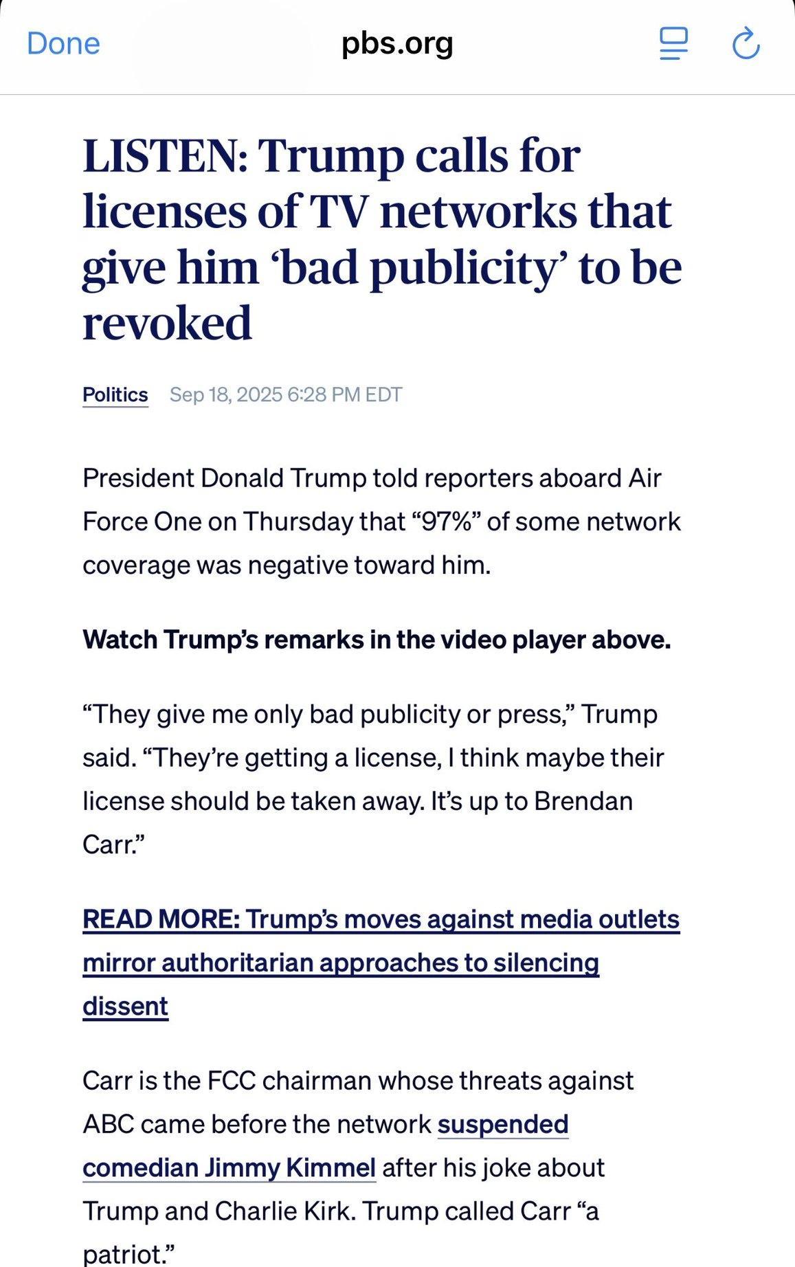 唐纳德·特朗普建议联邦通讯委员会FCC对那些对他进行负面报道的电视台吊销执照: “我曾在某处看到过,97% 的电视台都反对我……他们只会给我负面报道。他们正在申请执照——我觉得或许应该吊销他们的执照。”