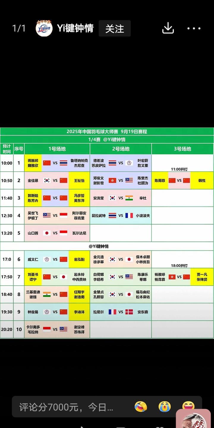 大师赛渐入佳境 羽毛球今日九场 今天(9月19日),2025中国羽毛球大师赛四强争夺战将陆续展开,国羽选手将参加九场角逐。 CCTV—5上午10:00体育频道将开始现场直播。 同时,CCTV5+体育频道下午17:00也将准时开播。 关注国羽的球迷朋友们不要错过噢。 大师赛渐入佳境,羽毛球今日九场。