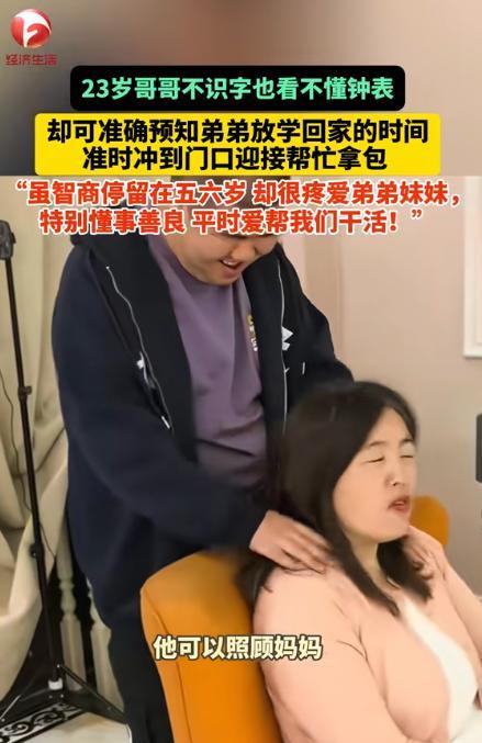 “泪目了!”山东,一23岁男孩因出生时缺氧,智力停留在五六岁,但神奇的是,他总能提前预知弟弟放学回家的时间,弟弟一回来,他就准时冲到门口迎接,并帮忙拿包! (信息来源 :AHTV第一时间 2025年9月16日) 张女士(化名)的大儿子,虽然不会看时间也不认识字,但每天一到时间他都会赶紧出去接弟弟,然后贴心的将书包拿回屋里面。 此外平时在家的时候,大儿子也经常会帮助做家务,甚至在父亲干一天活回来的时候主动帮助爸爸按摩,面对这样懂事的孩子,大家肯定都在想大儿子一定很聪明吧。 其实并不是,根据张女士的描述,大儿子今年已经二十多岁了,但之后几岁孩子的智商甚至比弟弟的智商都要低很多。 因为当时在张女士怀大儿子的时候,没有及时的发现缺氧,随后到了八个多月的时候才发现,但当时去了好几家医院之后,都说孩子生出来之后很大可能会是脑瘫。 此消息一出来的时候,张女士以及家人一时之间都很难以接受,但过了几天之后张女士不管孩子生出来怎么样还是准备就孩子生下来,随后在孩子出生之后,张女士带孩子去了很多家康复机构。 甚至到了上学的年纪还让孩子去了一些专门给特殊儿童开设的学校,但最后还是没有能够提升孩子的智力。于是张女士就想着自己在家教育自己的大儿子。 就这样大儿子在张女士的教育下,虽然没有高智商,但是有高情商,很知道体谅父母的辛苦,而且经锻炼之后也可以在家做力所能及的事情。 此外张女士还骄傲的说到,大儿子不仅是自己最得力的小助手而且还是家里面的“开心豆”,还说到有一次自己不舒服的时候大儿子就守护在身边照顾自己让她很是感动。 很多网友看到这件事情之后在下面留言说:自己身边也有一个这样的人,虽然智商不高但是对待人特别的真诚,而且每天都活的自由自在的,感觉很幸福。 那么的你身边遇见过这样的人吗?